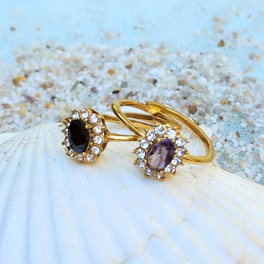 ADJUSTABLE HEARTS - CZ CITIRNE AMETHYST OR EMERALD WATERPROOF 18K GOLD RINGS