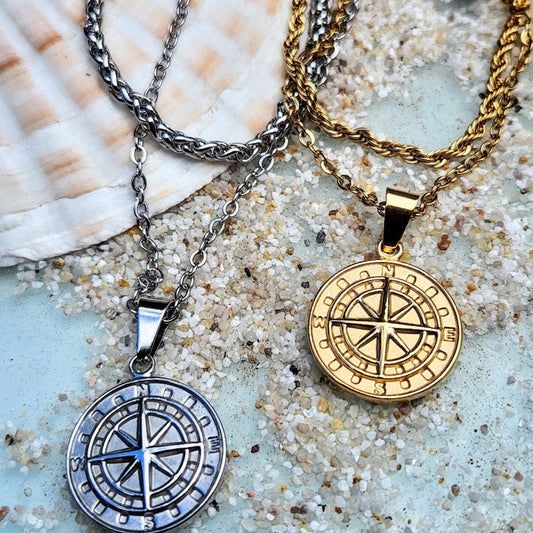 COMPASS - DOUBLE SILVER OR 18K GOLD WHEAT CHAIN WATERPROOF NECKLACES