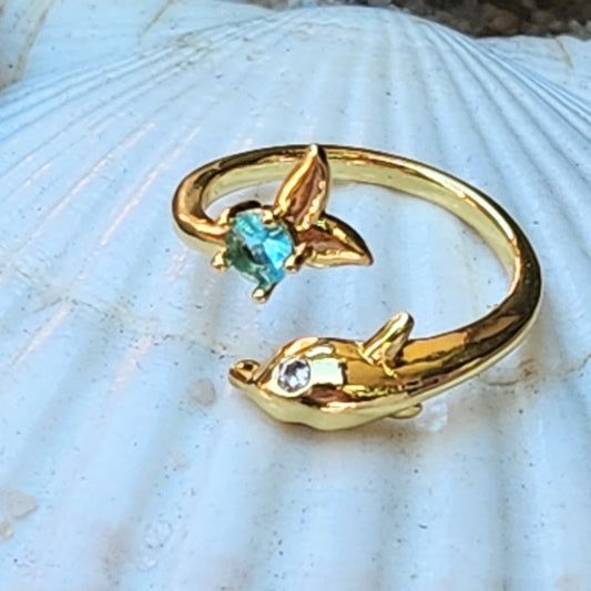 BLUE DOLPHIN - AQUAMARINE CZ ADJUSTABLE WATERPROOF 18K GOLD RING