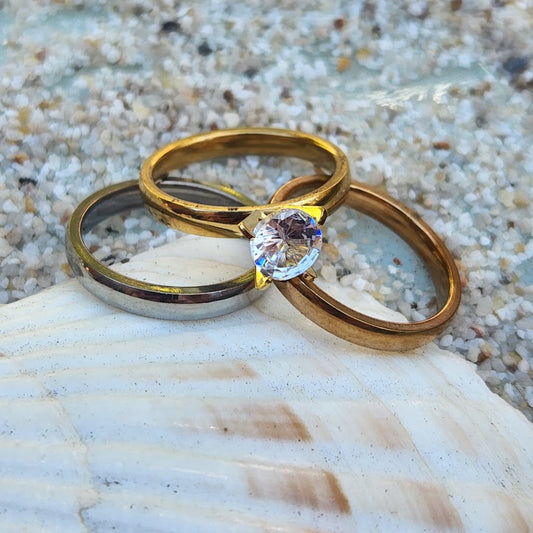 TONE OF THREE - CZ WATERPROOF GOLD SILVER & ROSE GOLD RING SET