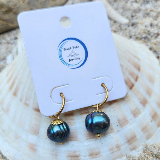 PERLE NOIR - BLACK PEARL HOOP STUD - 18K GOLD - WATERPROOF EARRINGS
