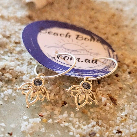 BLUE LOTUS - 925 SILVER HOOP TOPAZ LOTUS EARRINGS