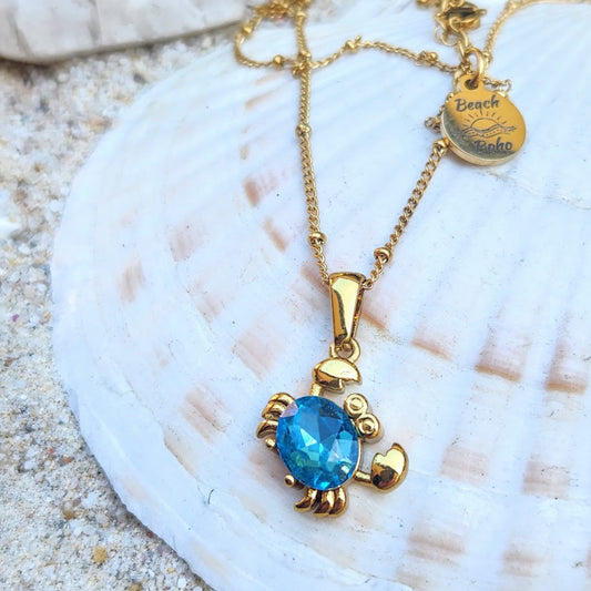 LITTLE CRAB - 18K GOLD AQUAMARINE CRAB CHARM WATERPROOF NECKLACE