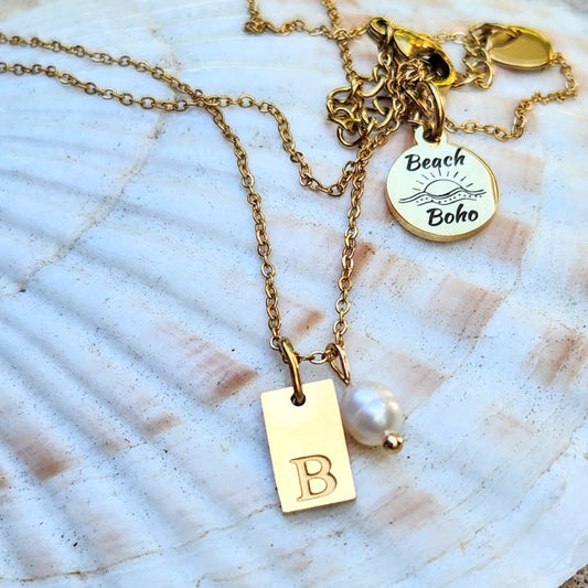 SQUARE INITIAL - WATERPROOF 18K GOLD OR SILVER DOUBLE PENDANT NECKLACE WITH BAROQUE PEARL