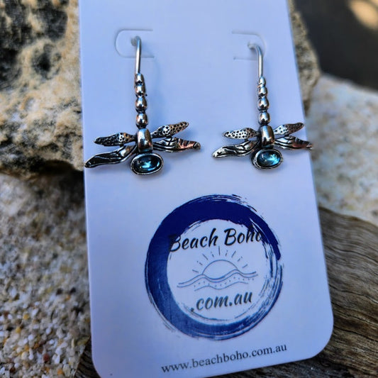 DRAGONFLY - BLUE TOPAZ CRYSTAL SILVER HOOK EARRINGS