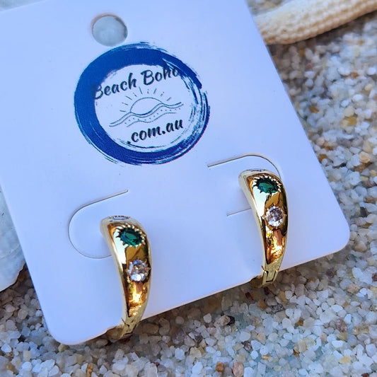 GREEN CUBIC ZIRCONIA - TINY HUGGIES / GOLD HOOP WATERPROOF EARRINGS