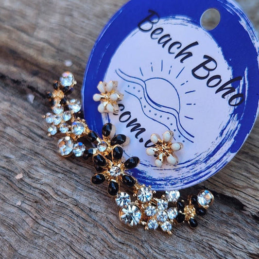 BLACK & WHITE DAISIES - BACK STUD GOLD PLATED EARRINGS