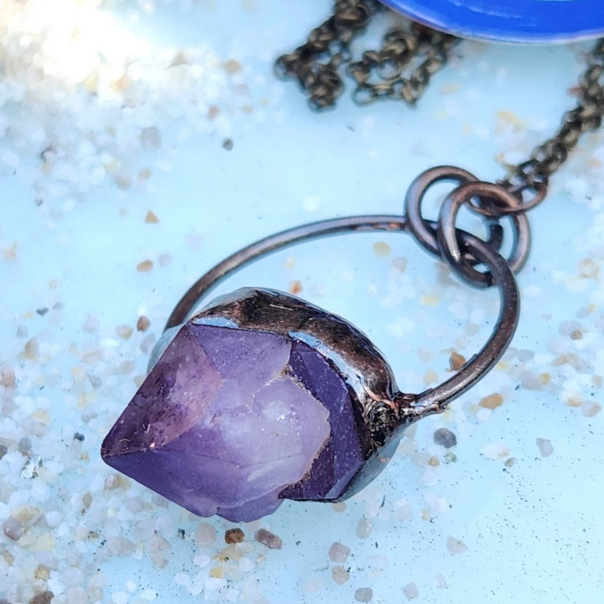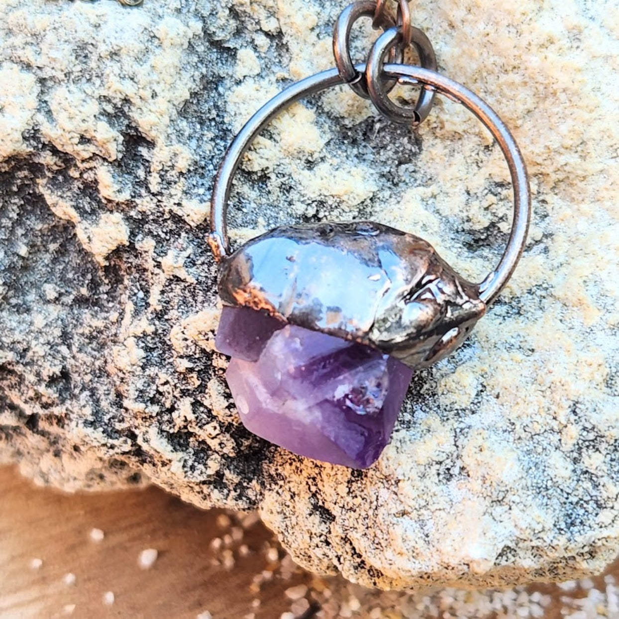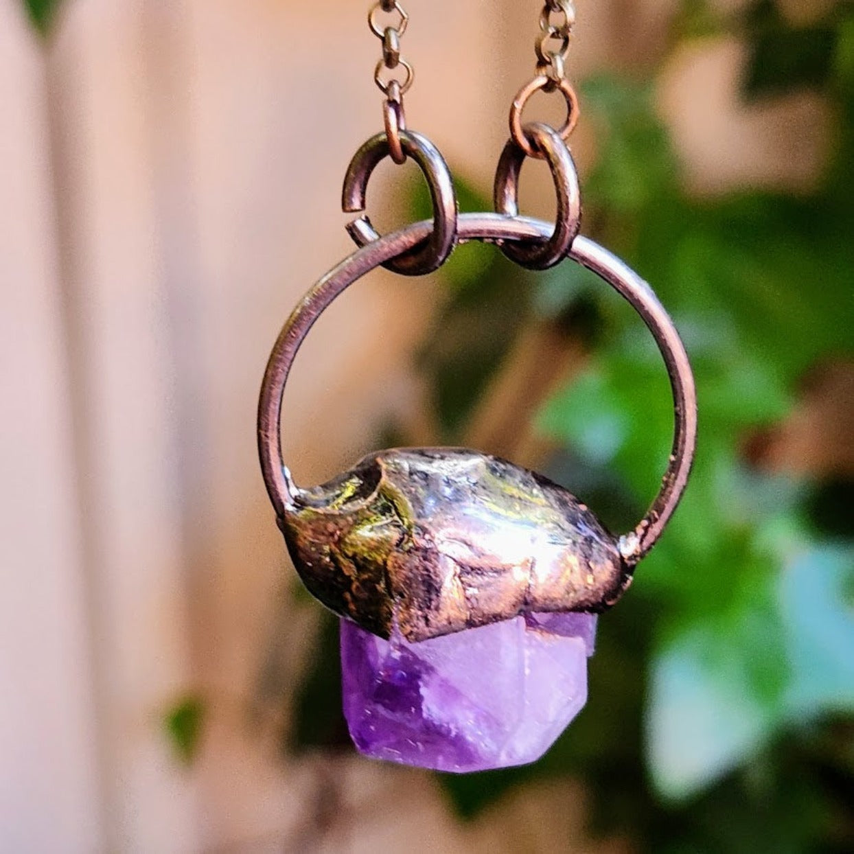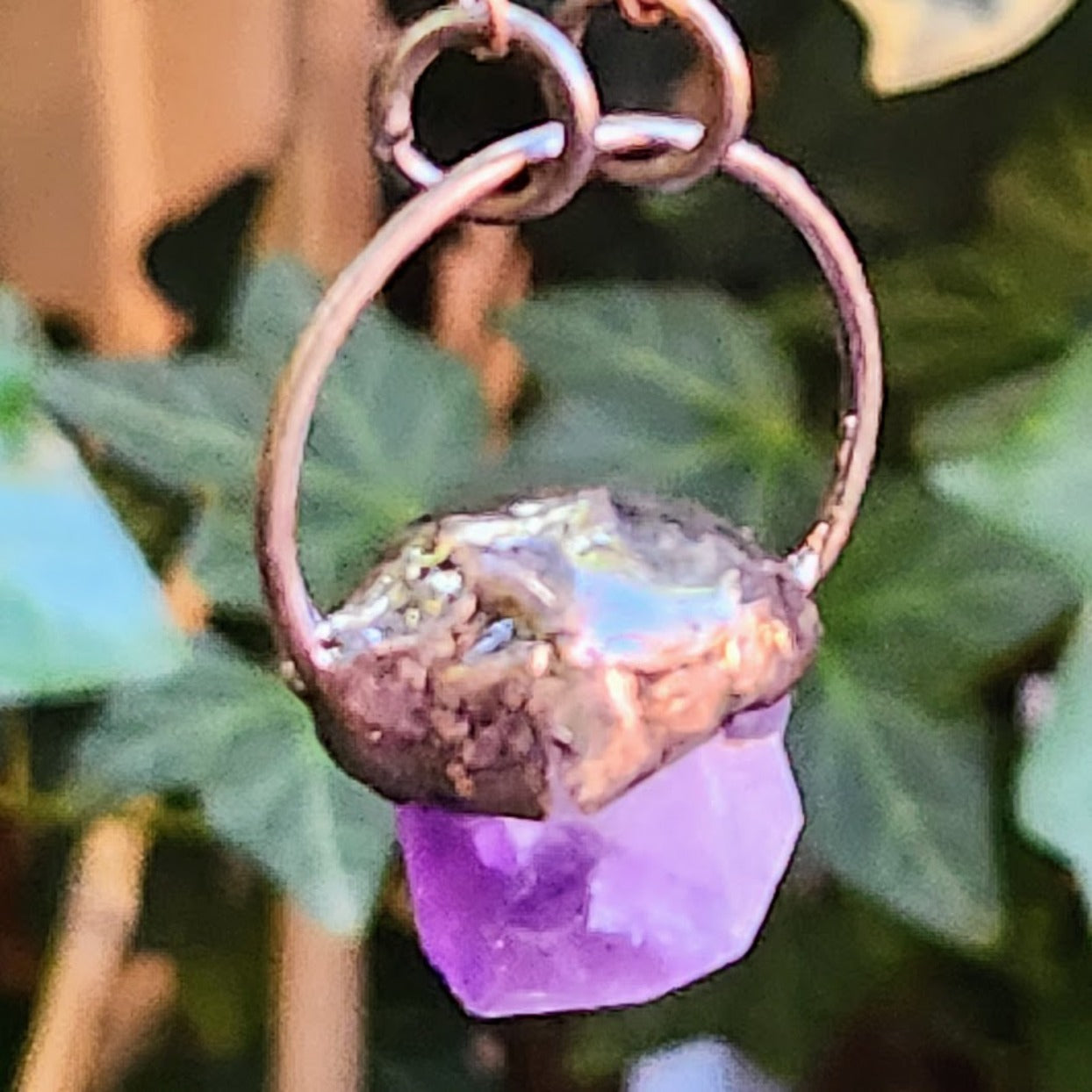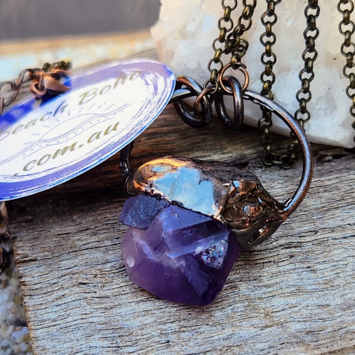 Natural Amethyst Crystal with Beautiful Rose Coloured Copper Long Chain 30 inch Necklace (can be adjusted on length if requested)