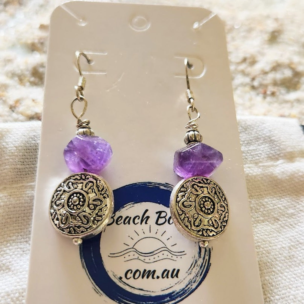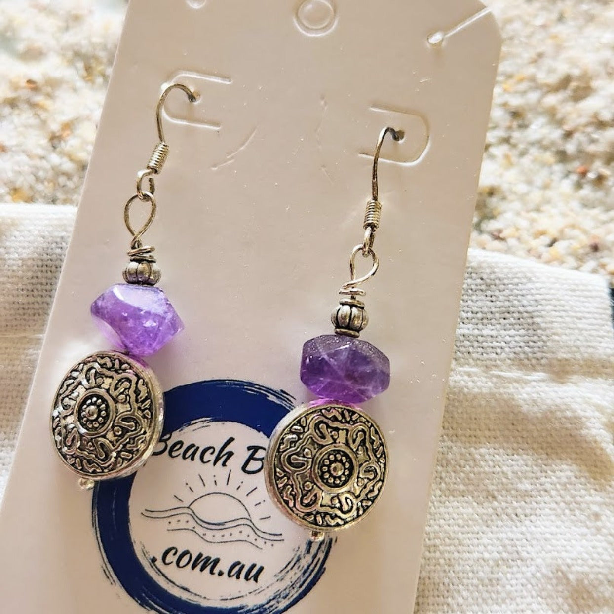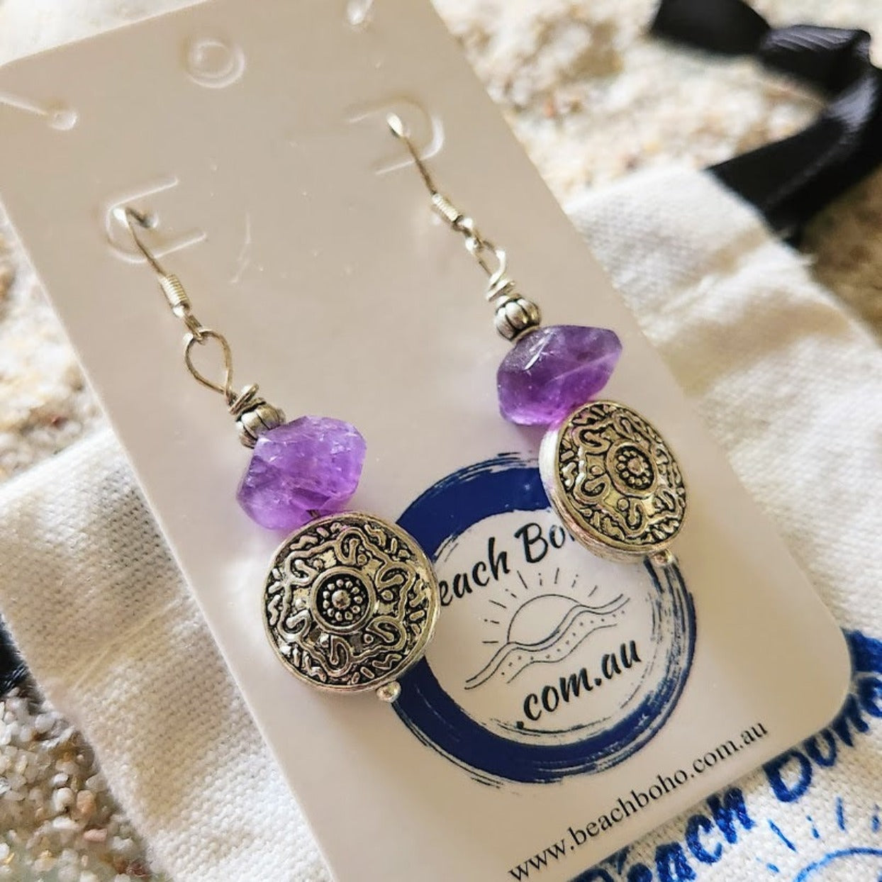 Natural Amethyst Crystal Mandala Silver 925 Hook Earrings / Silver Wire / Hyper Allergenic Hook