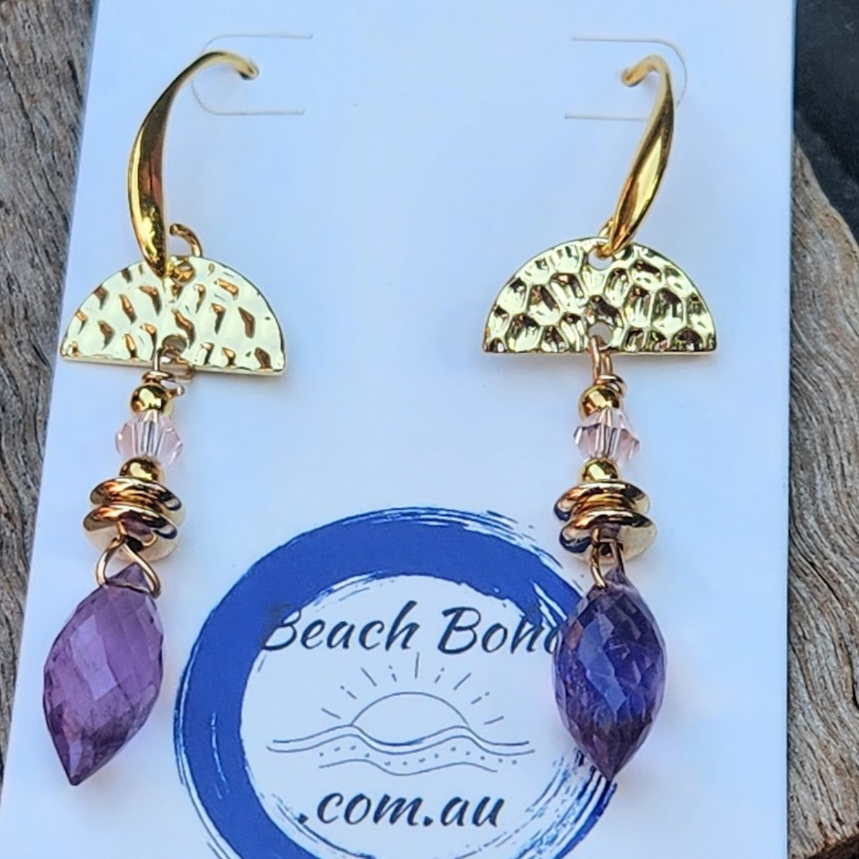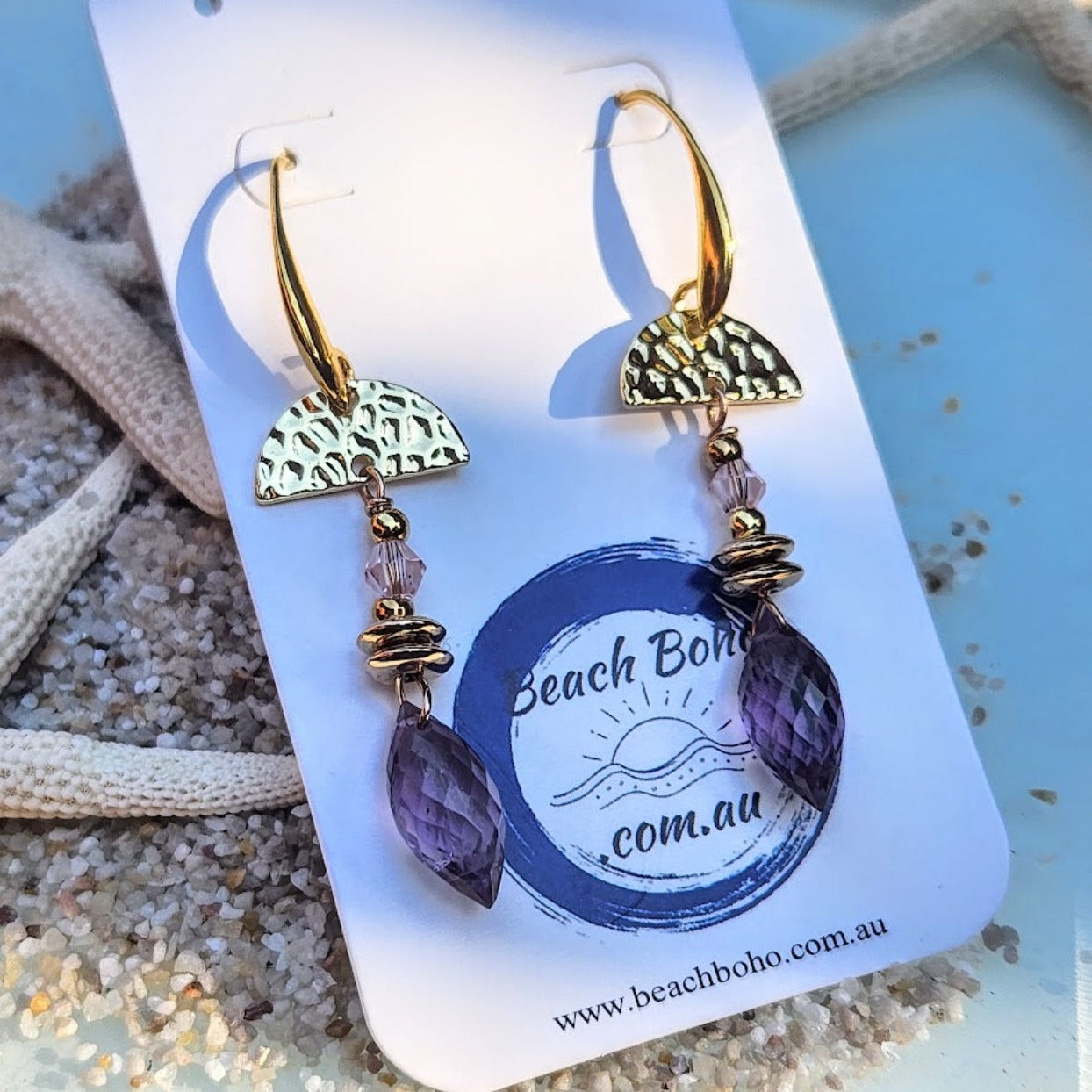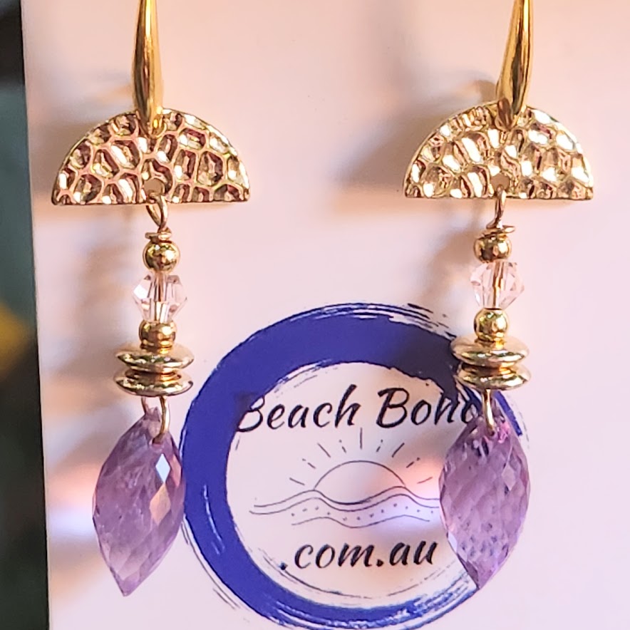 Amethyst Faceted Cut Crystals with Swarovski Rose Quartz Crystal and 14 ct Gold plated Hammered Half Moon Charm
