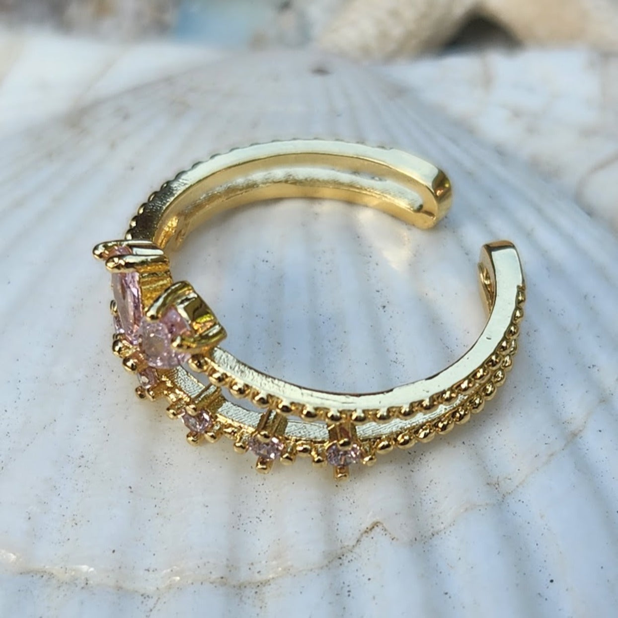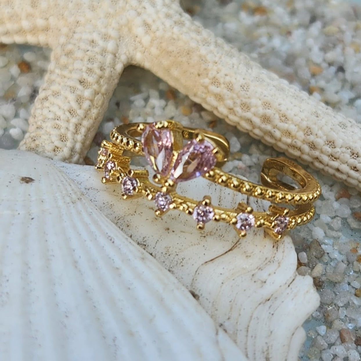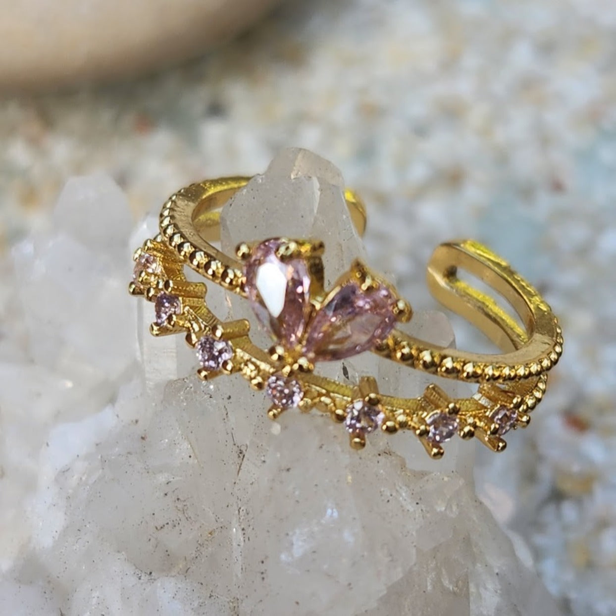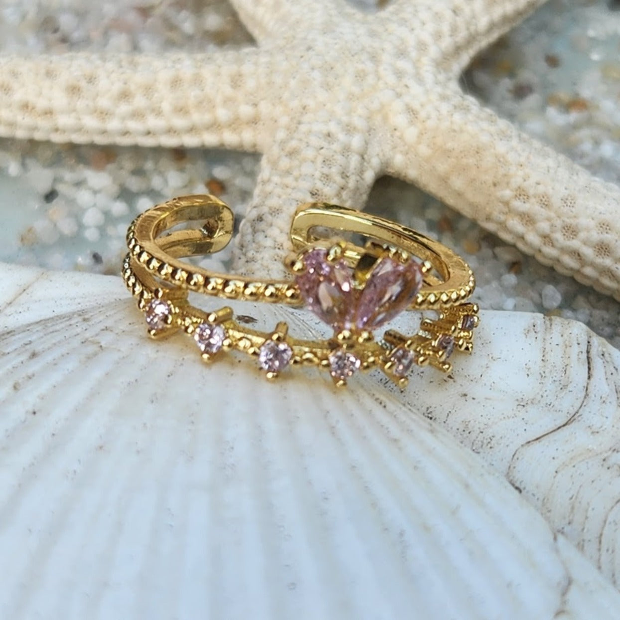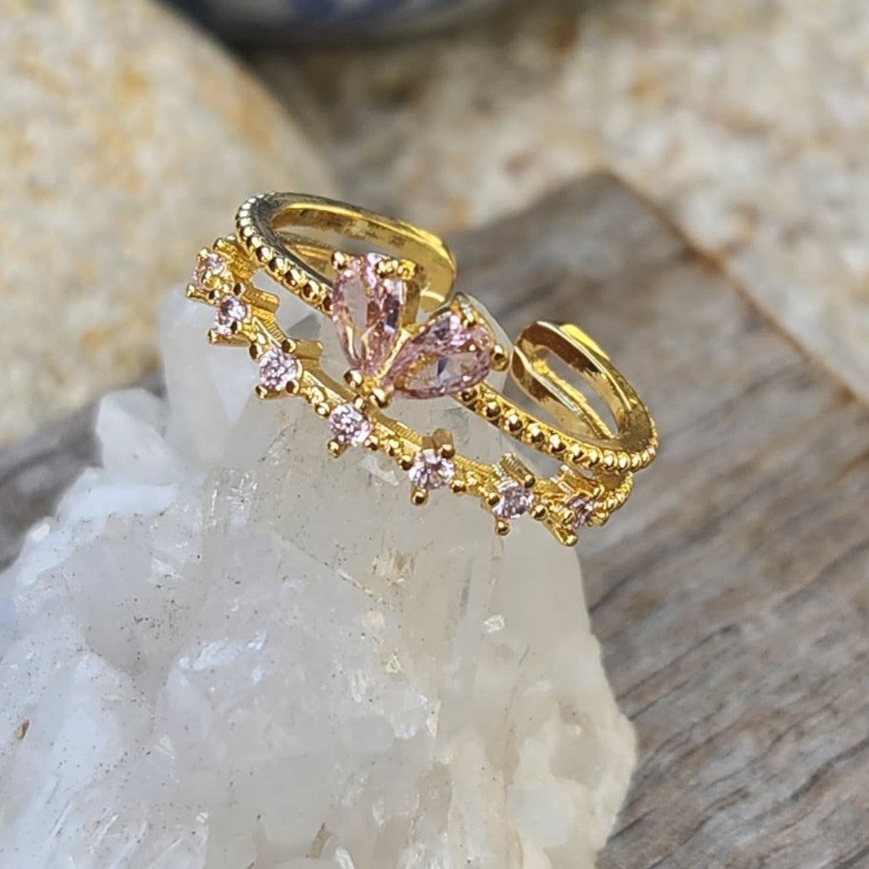 ANGLE WINGS - PINK & CRYSTAL CUBIC ZIRCONIA ADJUSTABLE WATERPROOF GOLD RING