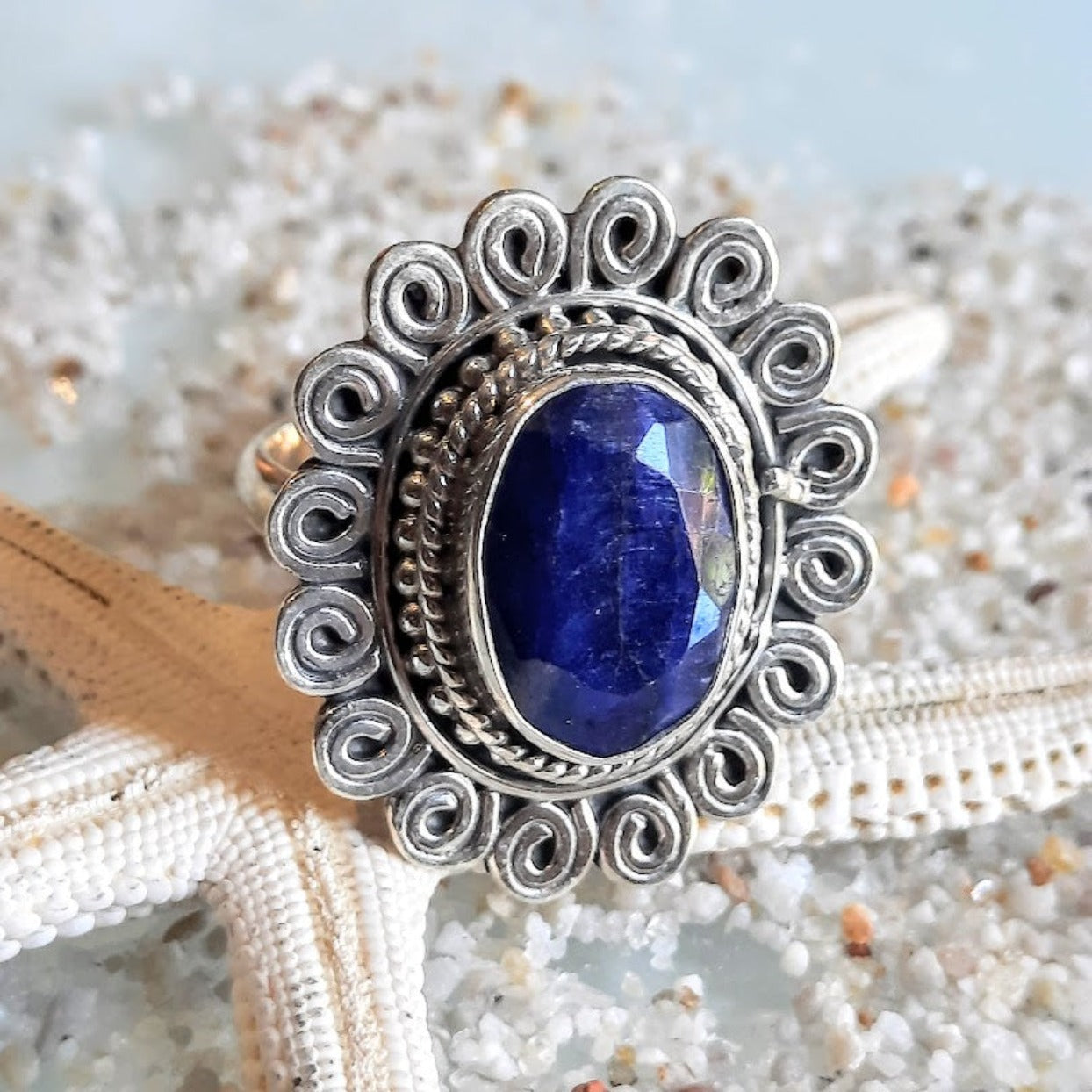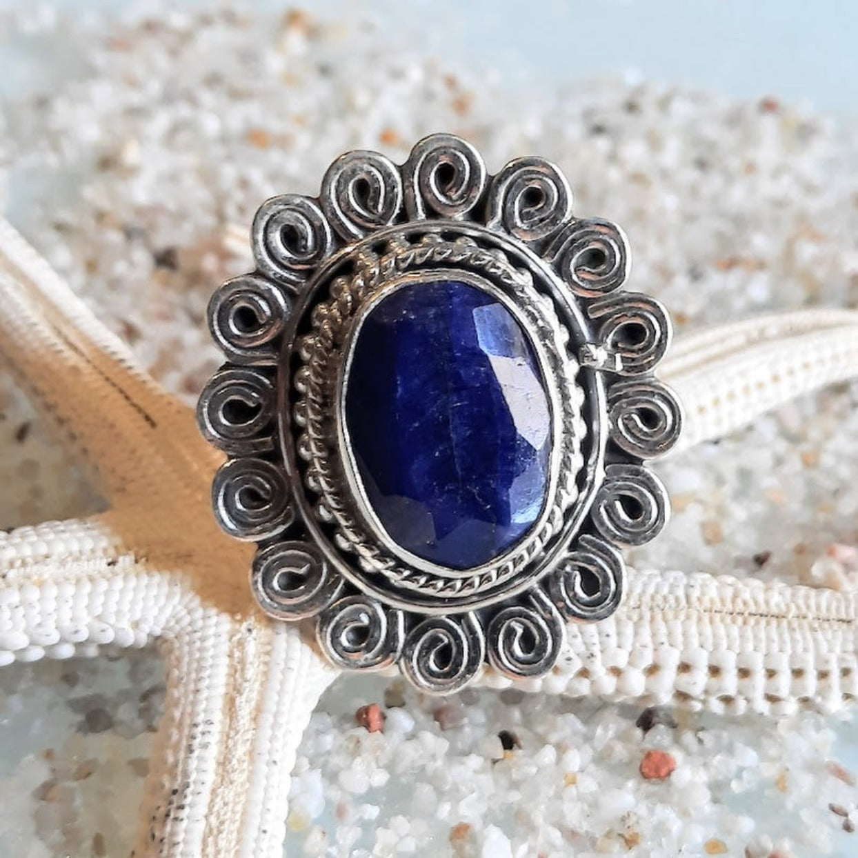 Natural Sapphire Stone with Flower 925 Detailing / Made with Natural Sapphire Stones