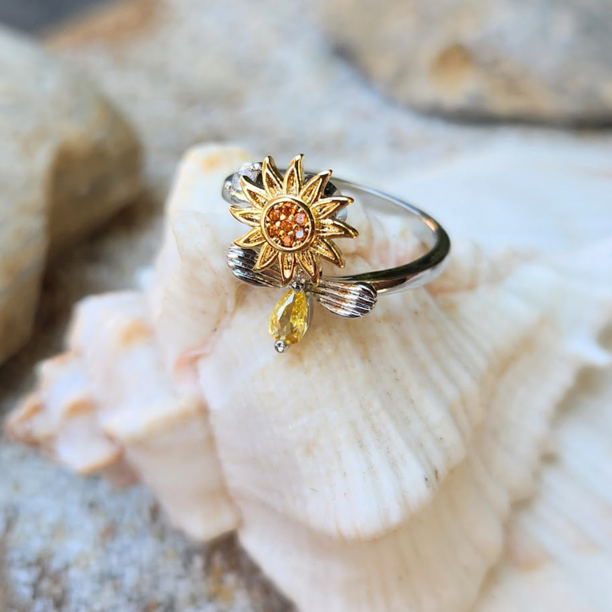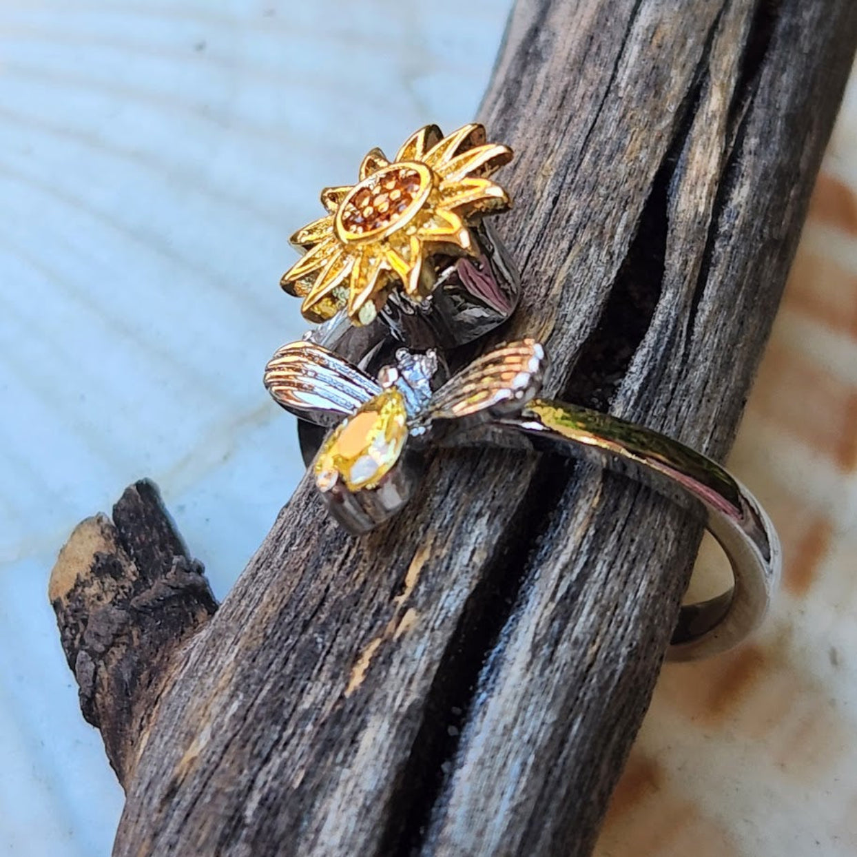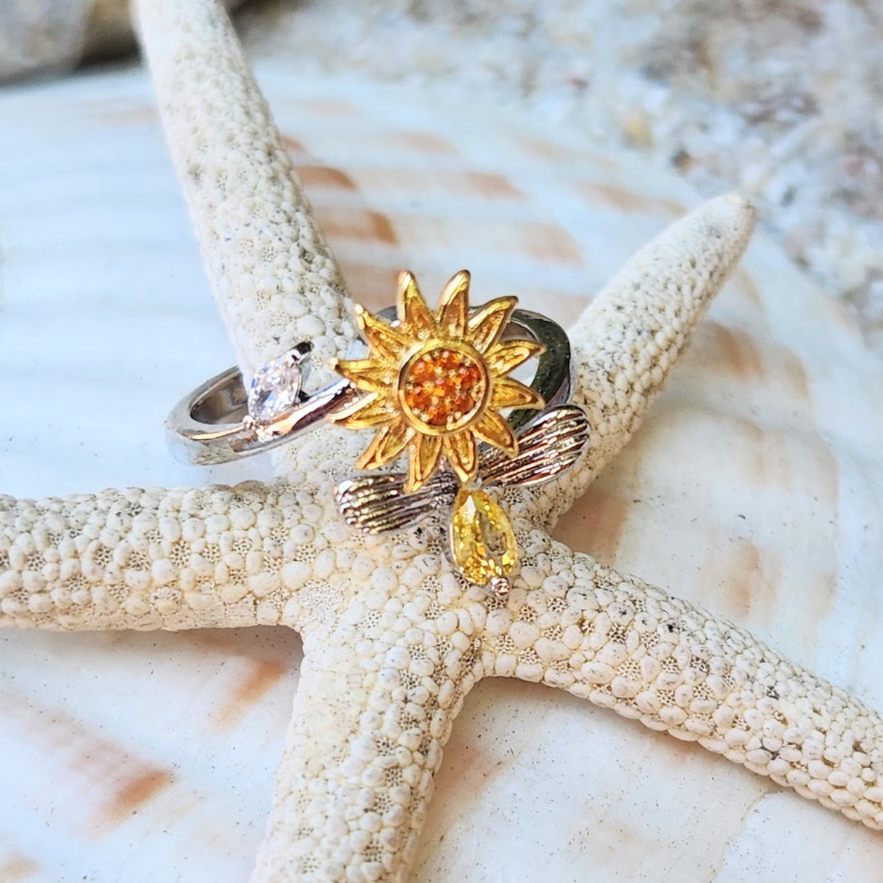Beautiful Unique Adjustable Daisy Fidget Ring with Citrine Cubic Zirconia Flower / Bee Design Easily Adjustable and comfortable to wear (Daisy Flower Spins around)