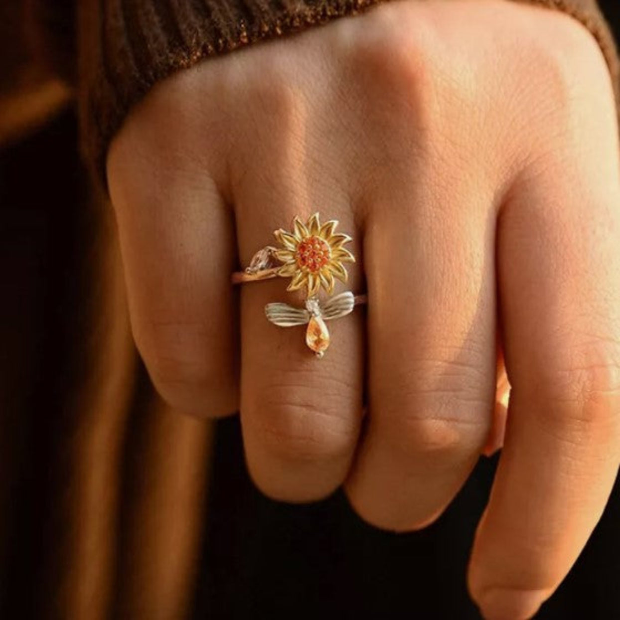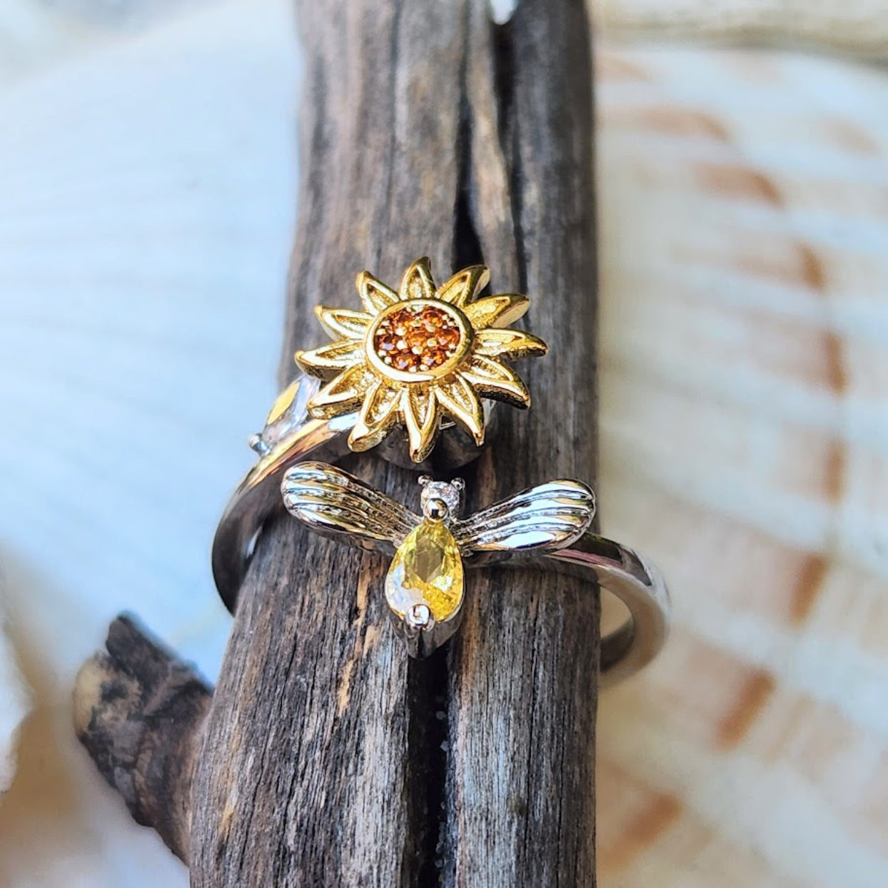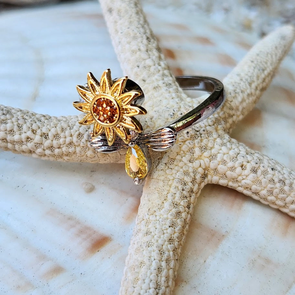 Beautiful Unique Adjustable Daisy Fidget Ring with Citrine Cubic Zirconia Flower / Bee Design Easily Adjustable and comfortable to wear (Daisy Flower Spins around)