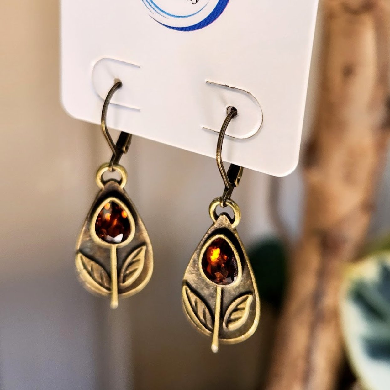 AMBER LEAVES - COPPER CRYSTAL HANDMADE HOOK EARRINGS