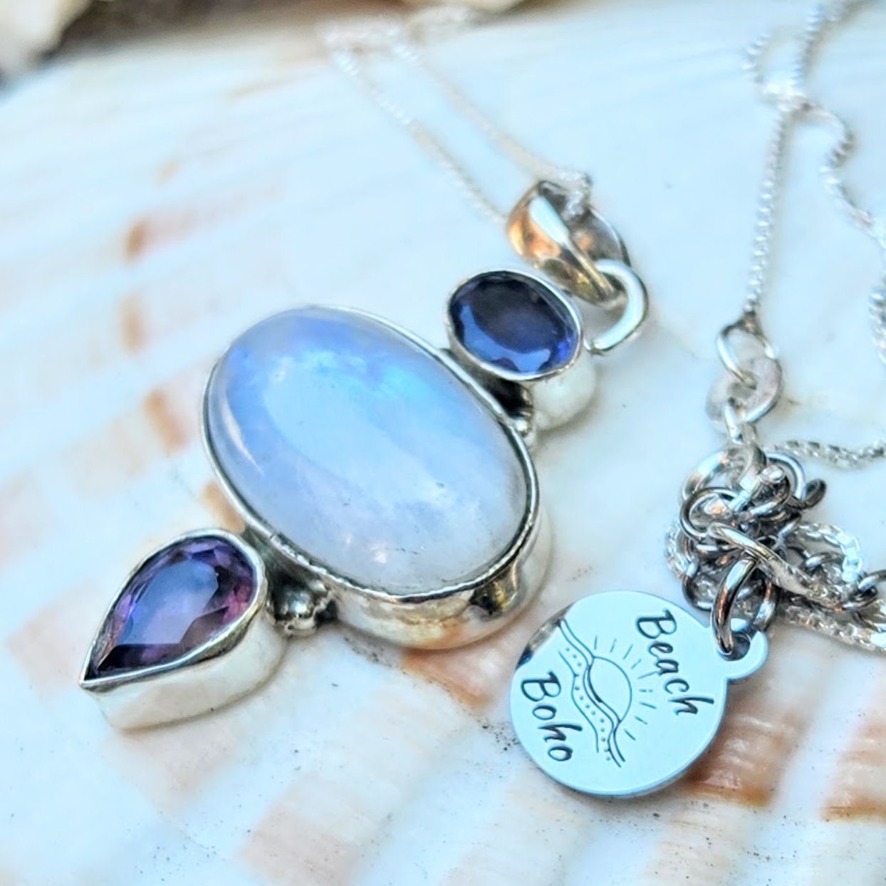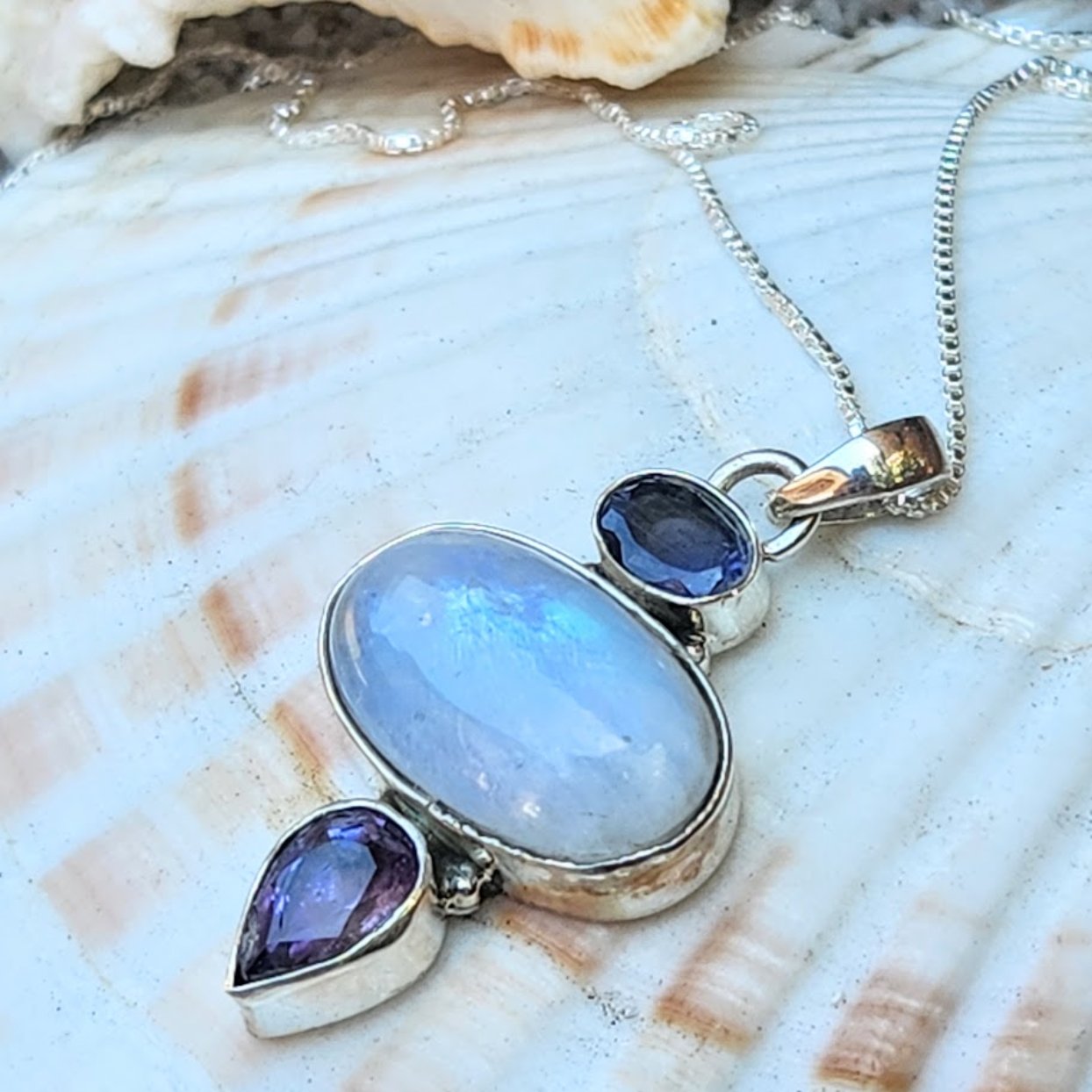 Handmade 925 Sterling Silver Moonstone / Iolite & Amethyst Pendant Necklace / Beautiful Silver Detailing