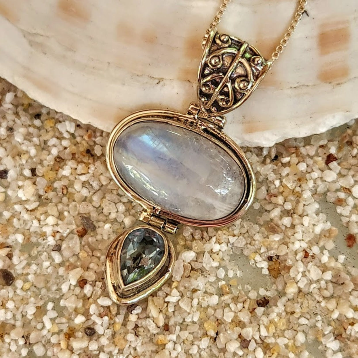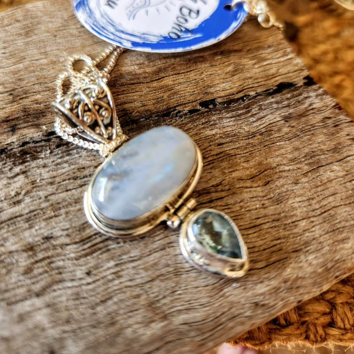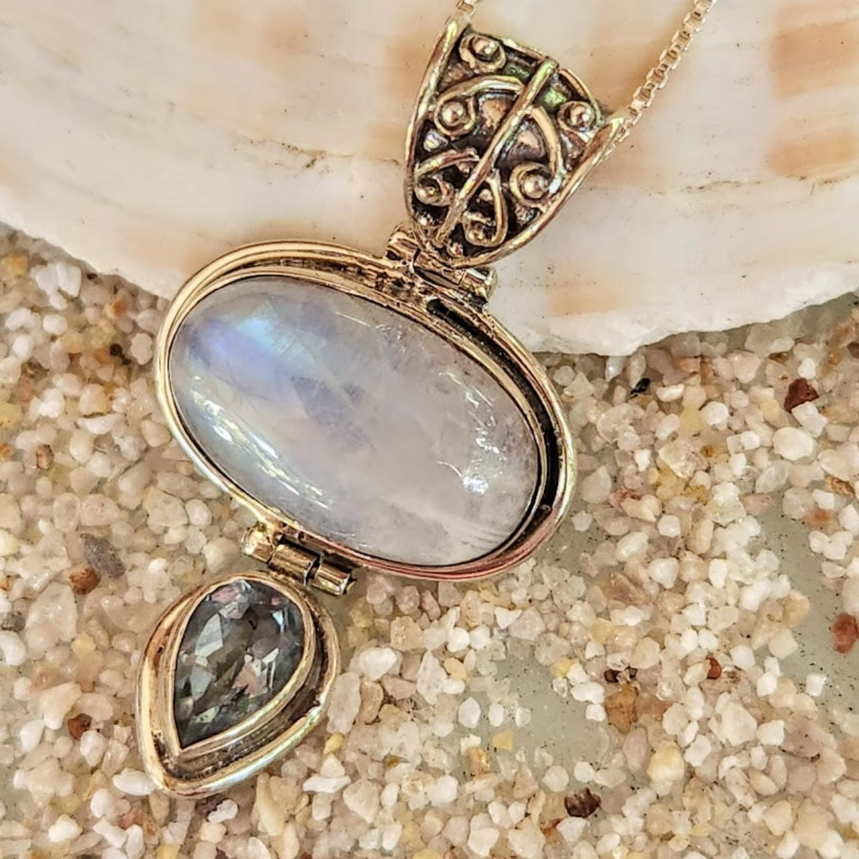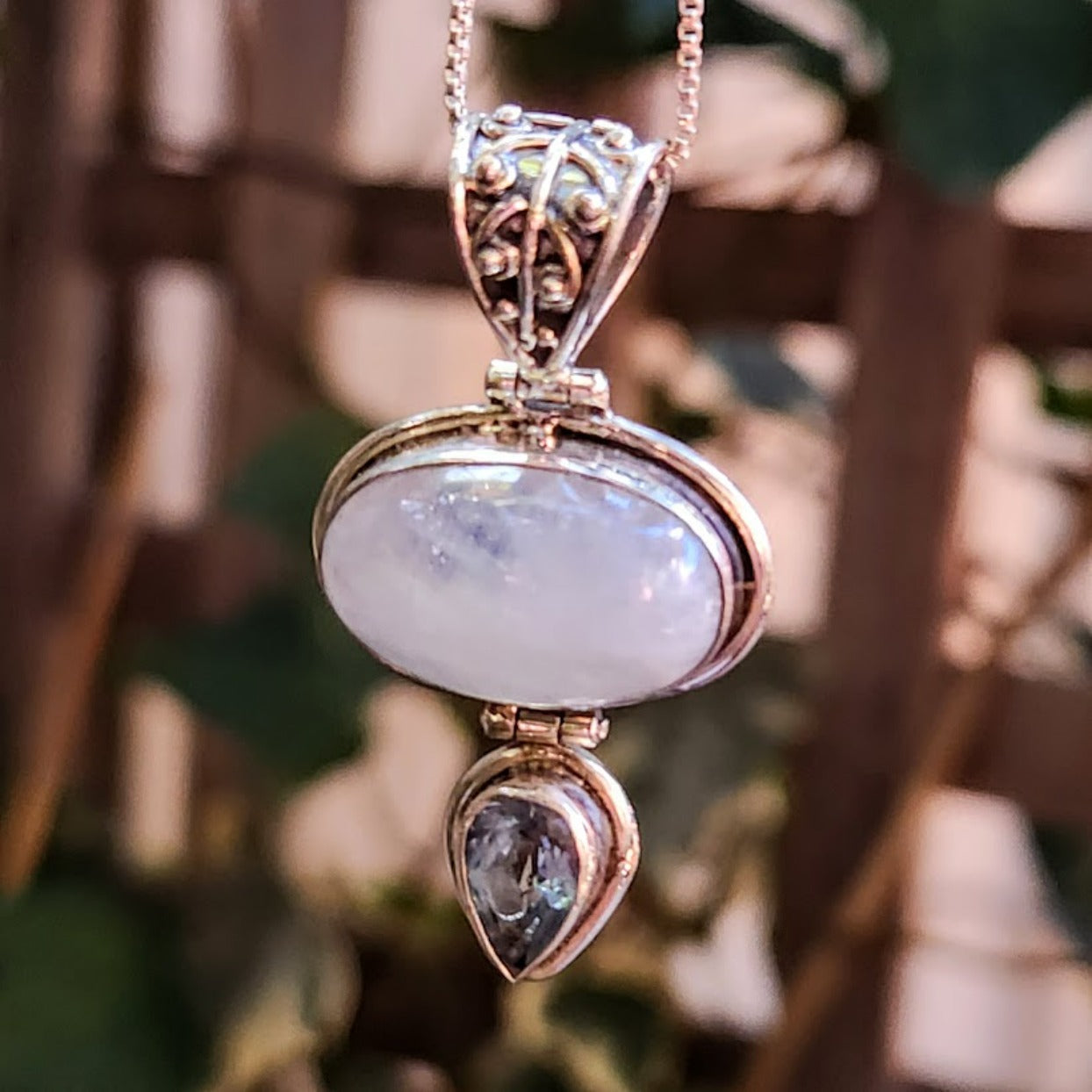 Moonstone / Silver Hinged with Topaz Teardrop Crystal / Each Piece Unique Made with Natural Moonstone & Topaz Crystals / Stainless Silver Steel Chain18 Inch Chain Included with silver polishing cloth