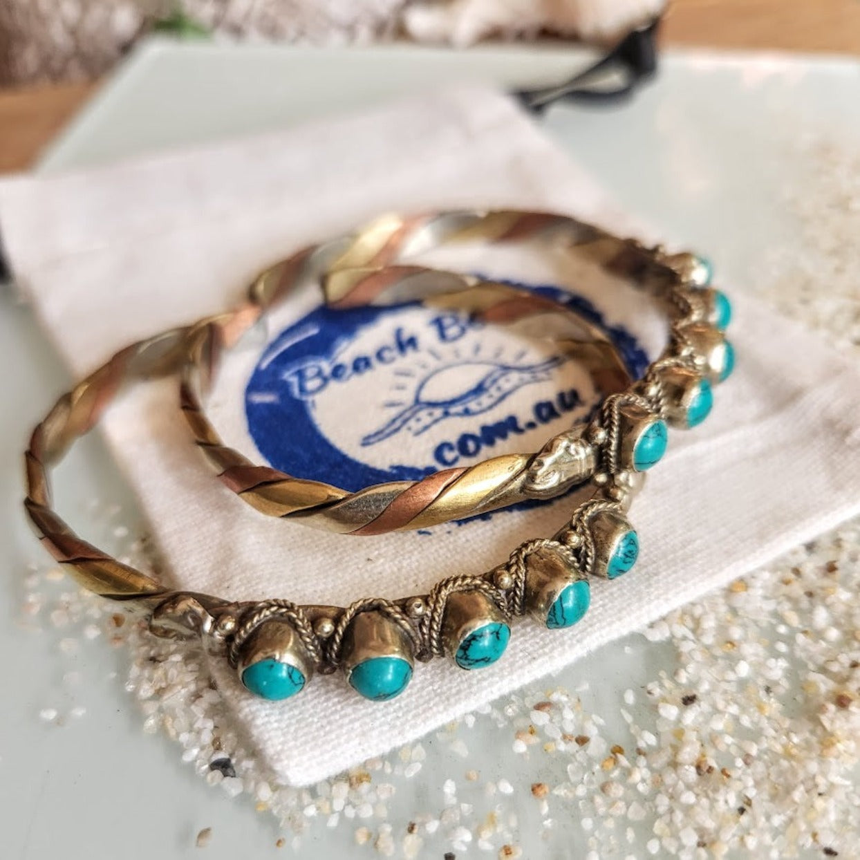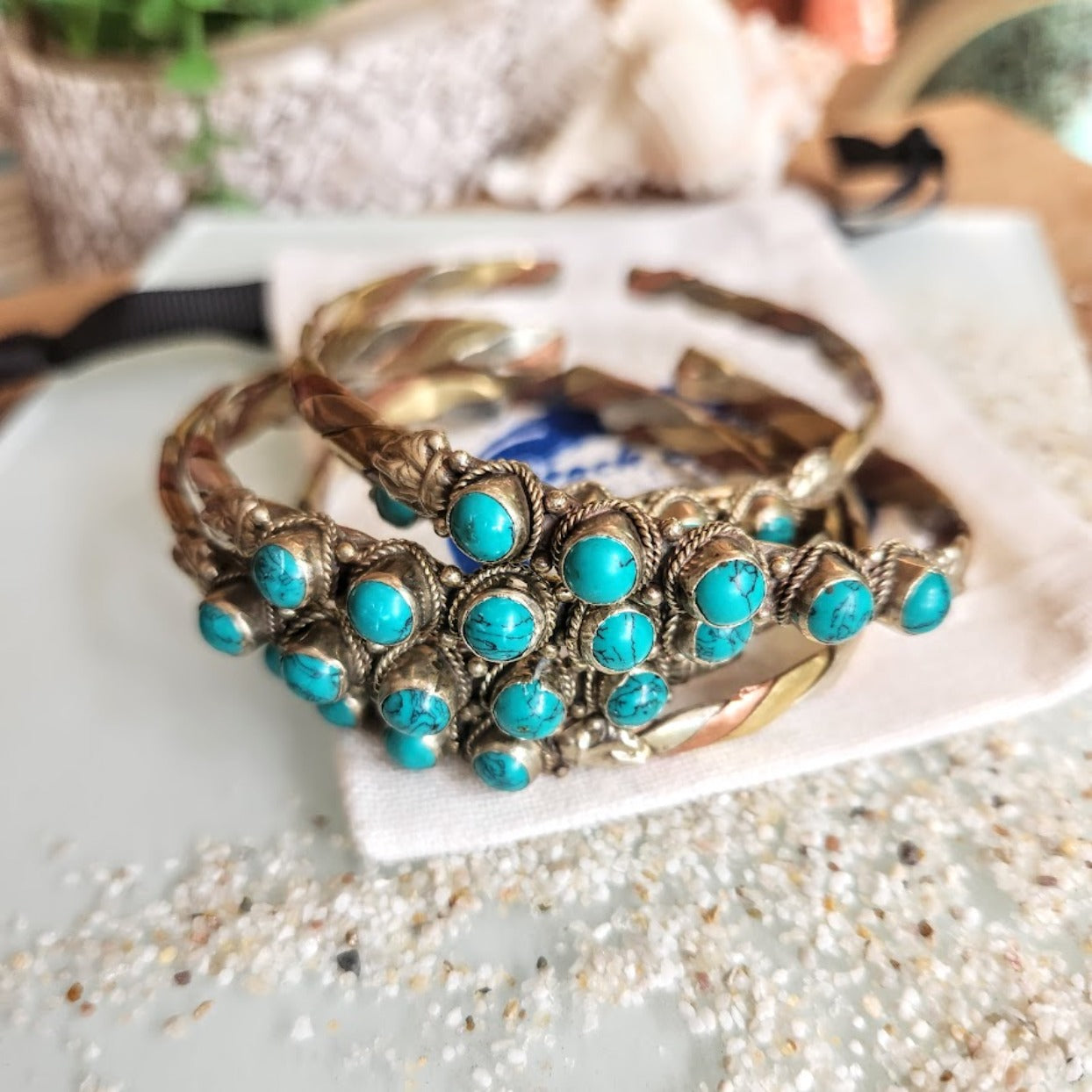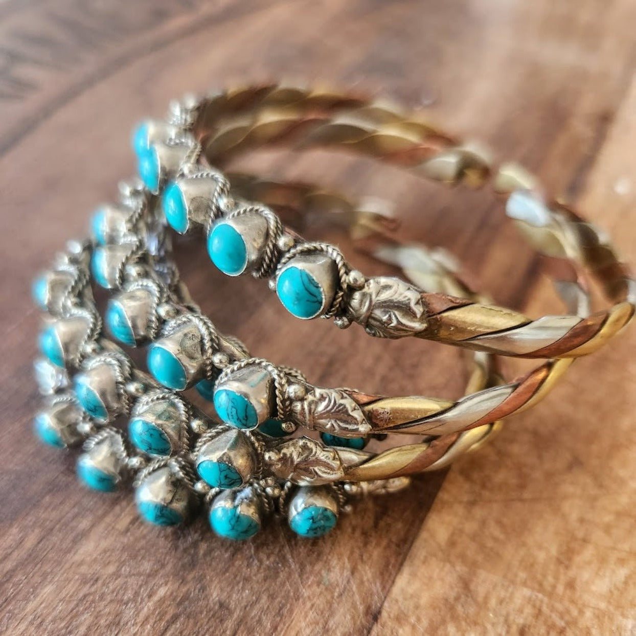 Natural Turquoise Stone / Copper, Brass and Silver Handmade Intertwined Cuffs