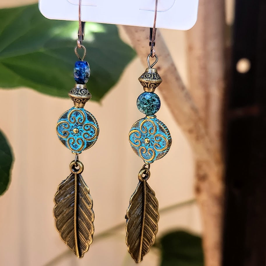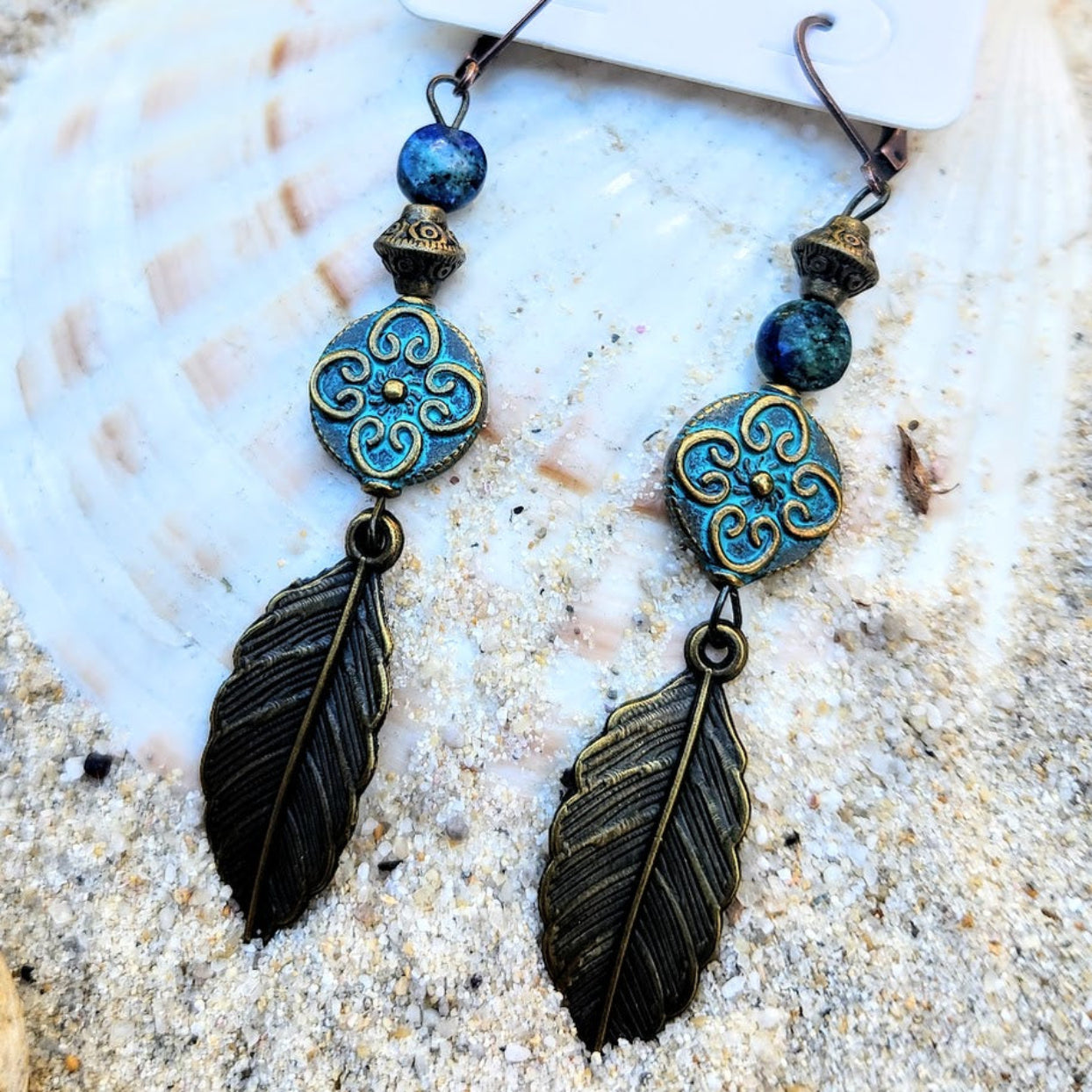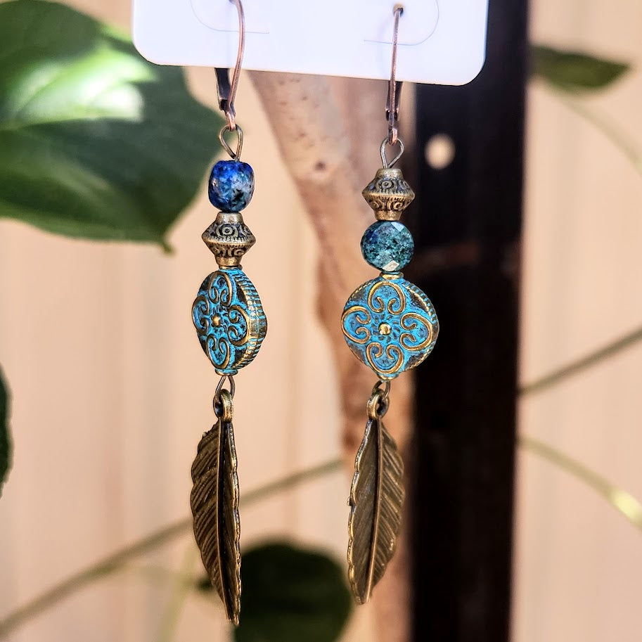 Handmade Agave Dark Blue Stones - Copper and Brass Feather Tribal Style Dangles