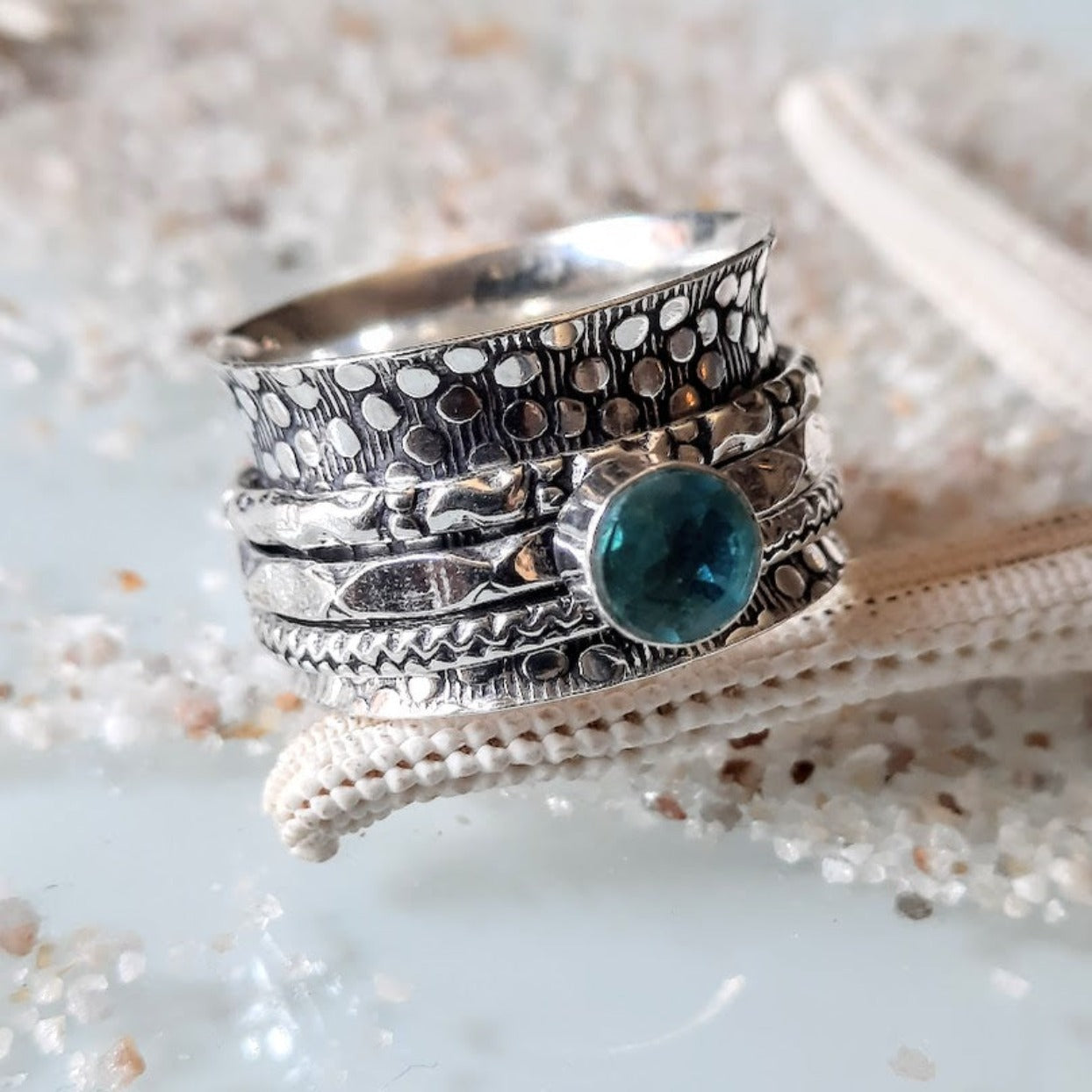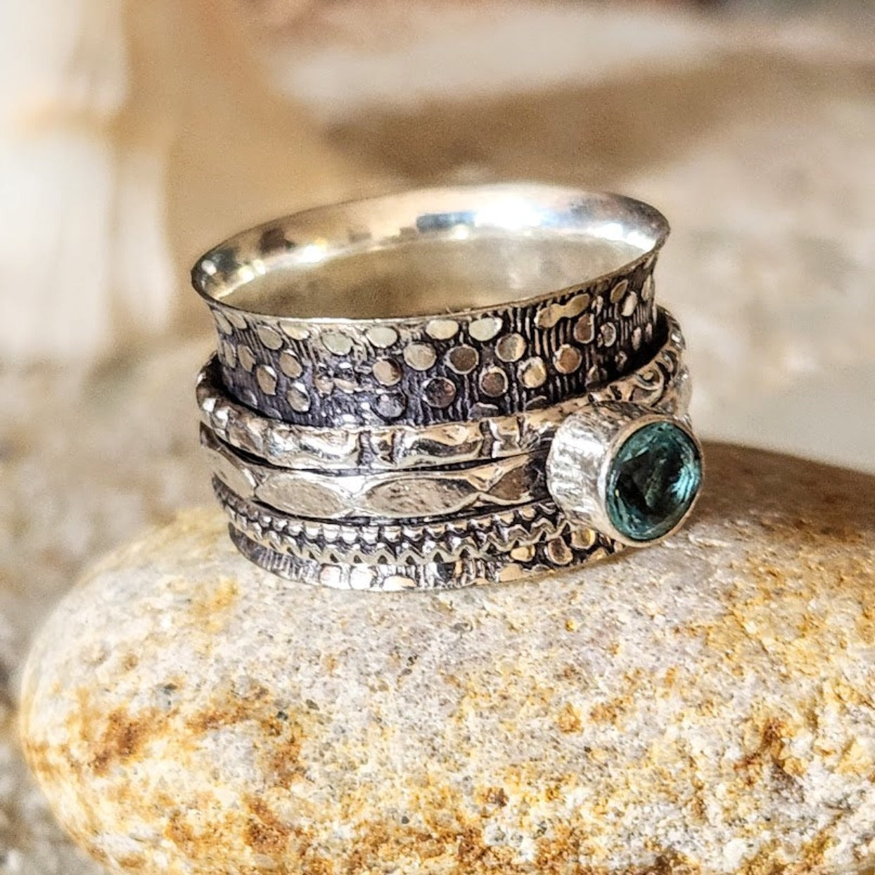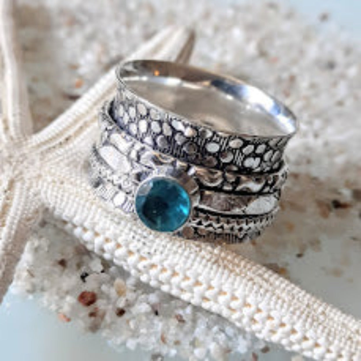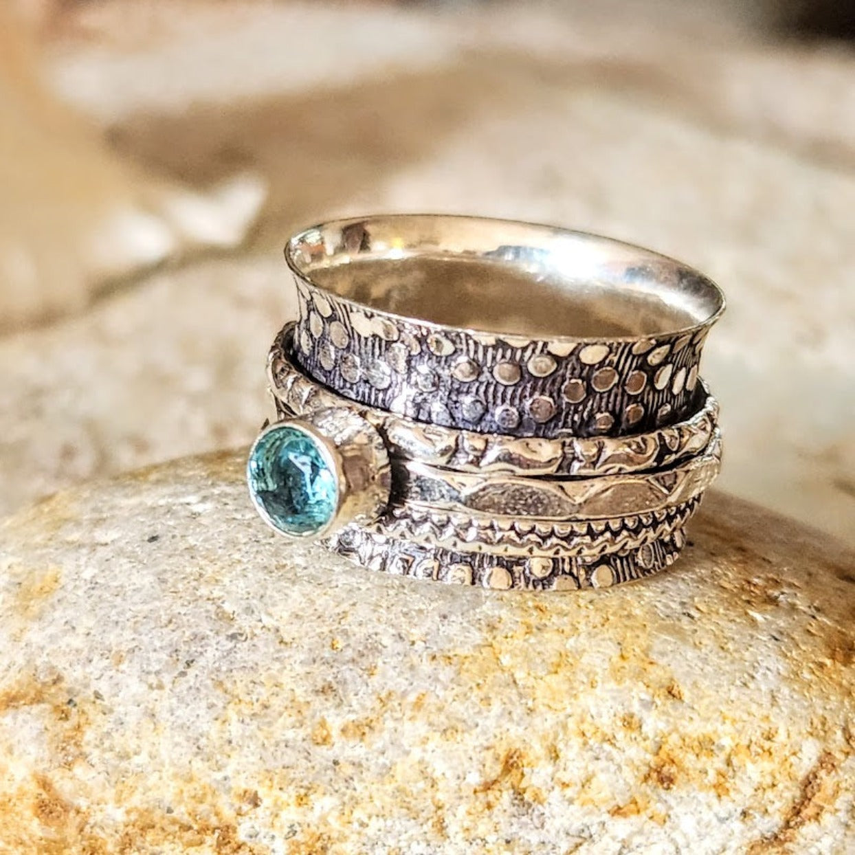 Blue TopazĀ spinner 925 Sterling Silver ring / Stunning Stamped Silver DetailingĀ