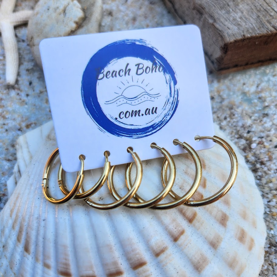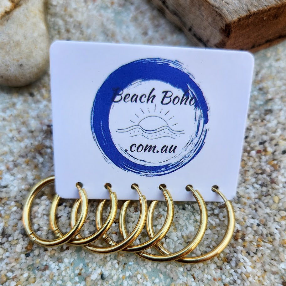 Set of 3 18k Gold Plated Or Silver Huggie Hoop Earrings incredibly comfortable & made with Titanium Steel Tarnish Resistant Jewellery 18 mm 16 mm & 14 mm (2mm thick) round. Perfect to wear all the time!