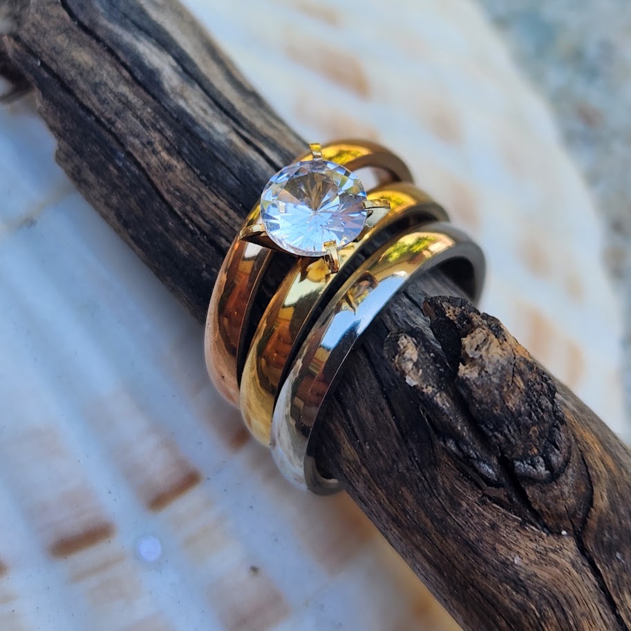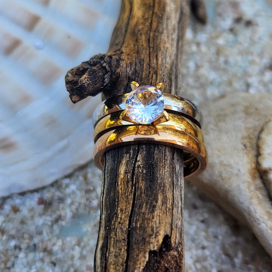 TONE OF THREE - CZ WATERPROOF GOLD SILVER & ROSE GOLD RING SET