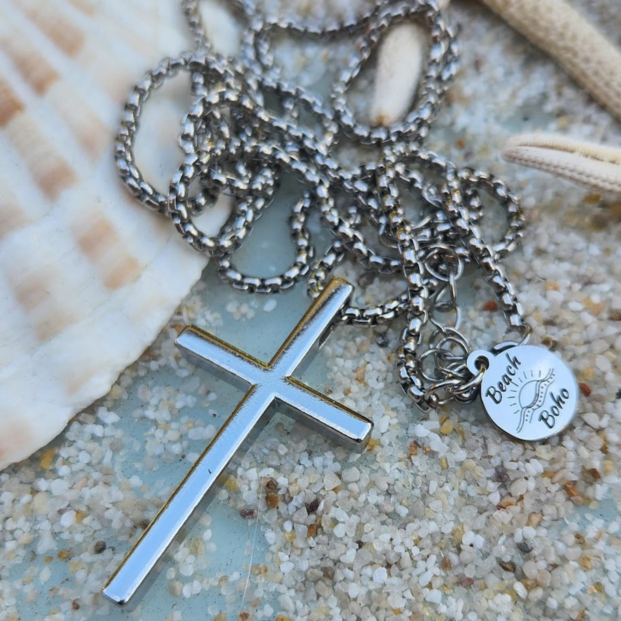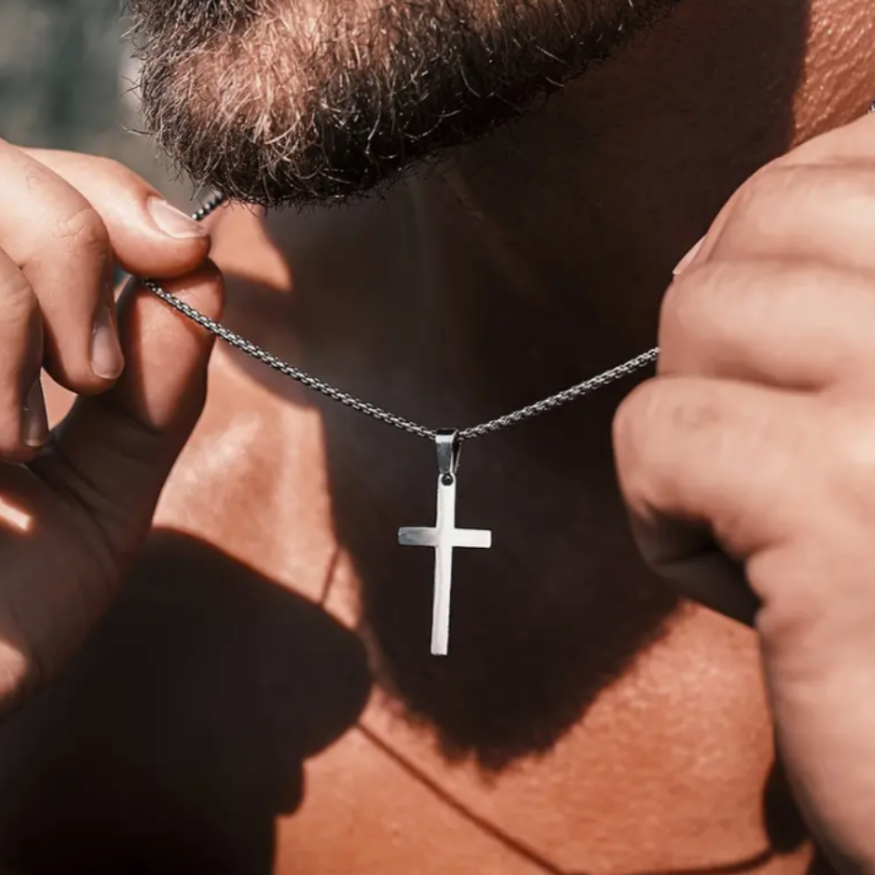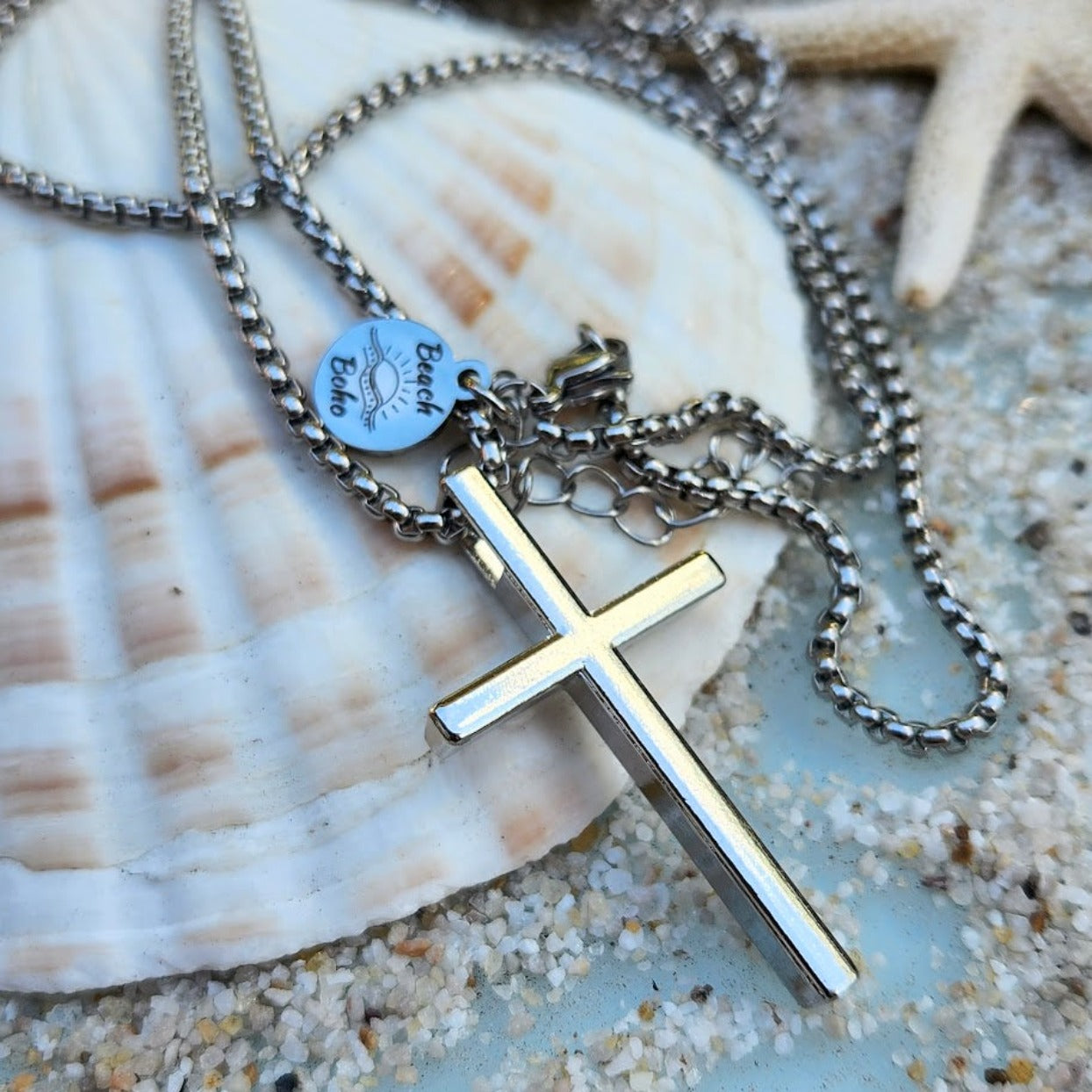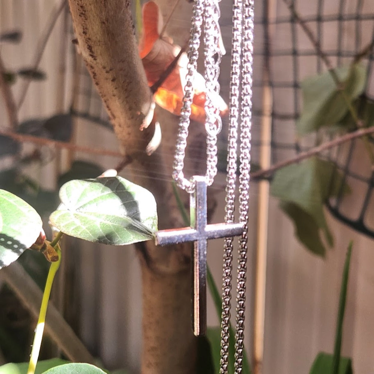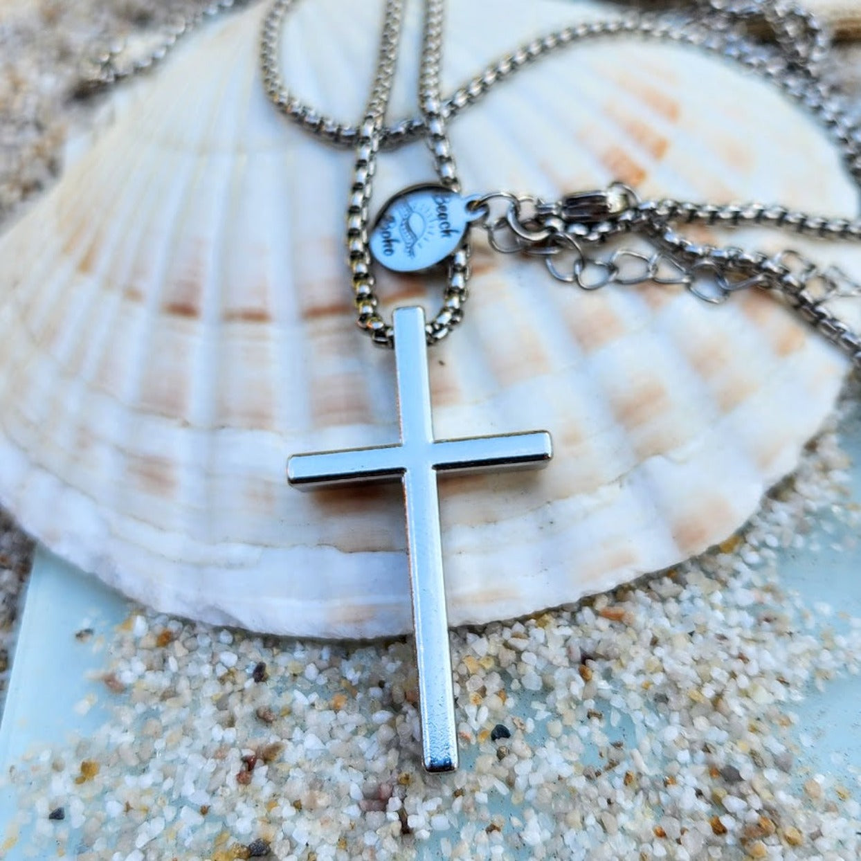 Men's Silver Box Chain Cross Pendant Waterproof Necklace