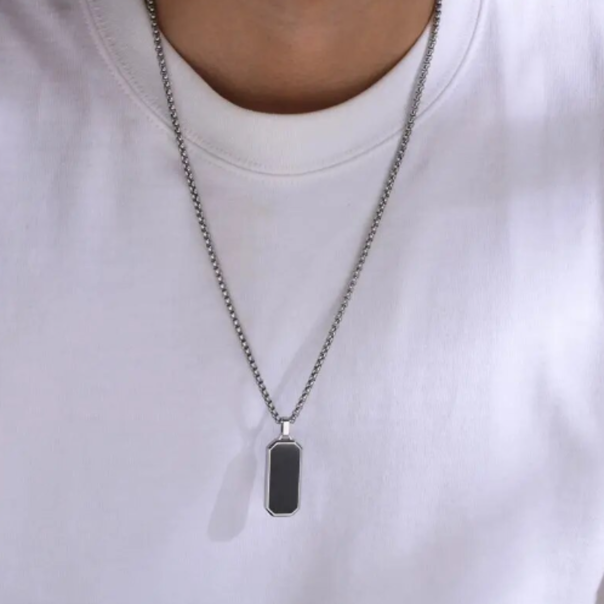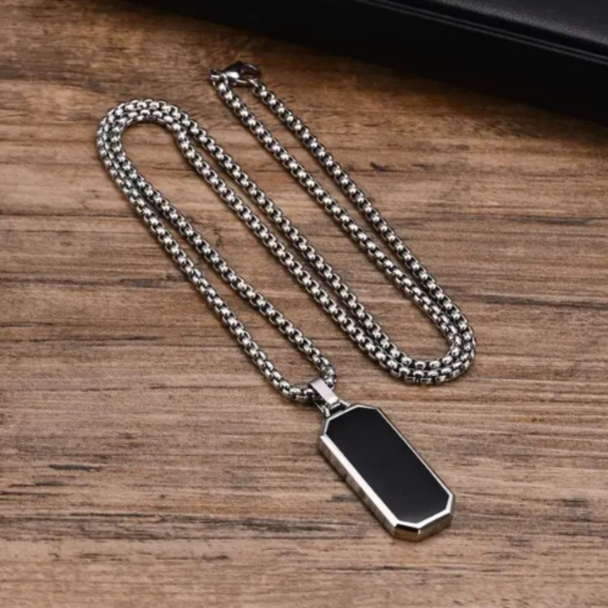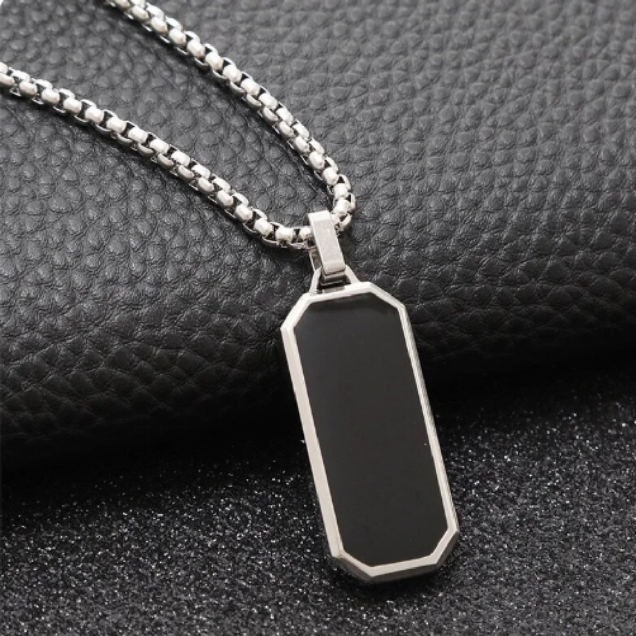 Black Rectangle Silver Men's Pendant Necklace - Silver Chain Necklace 70 cm Length
