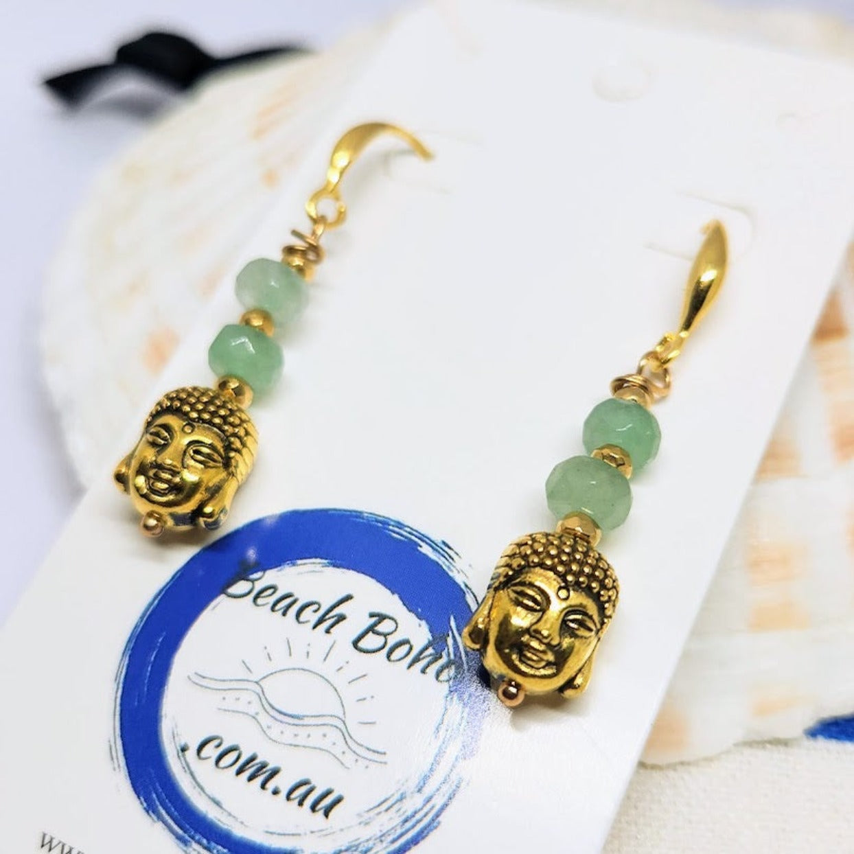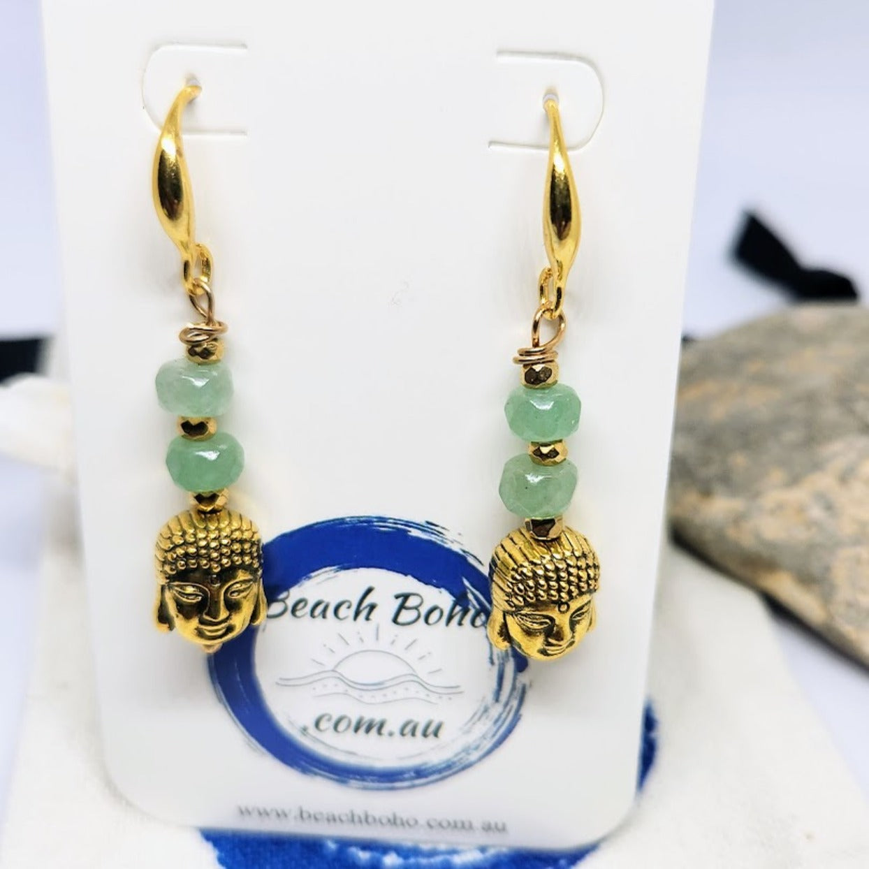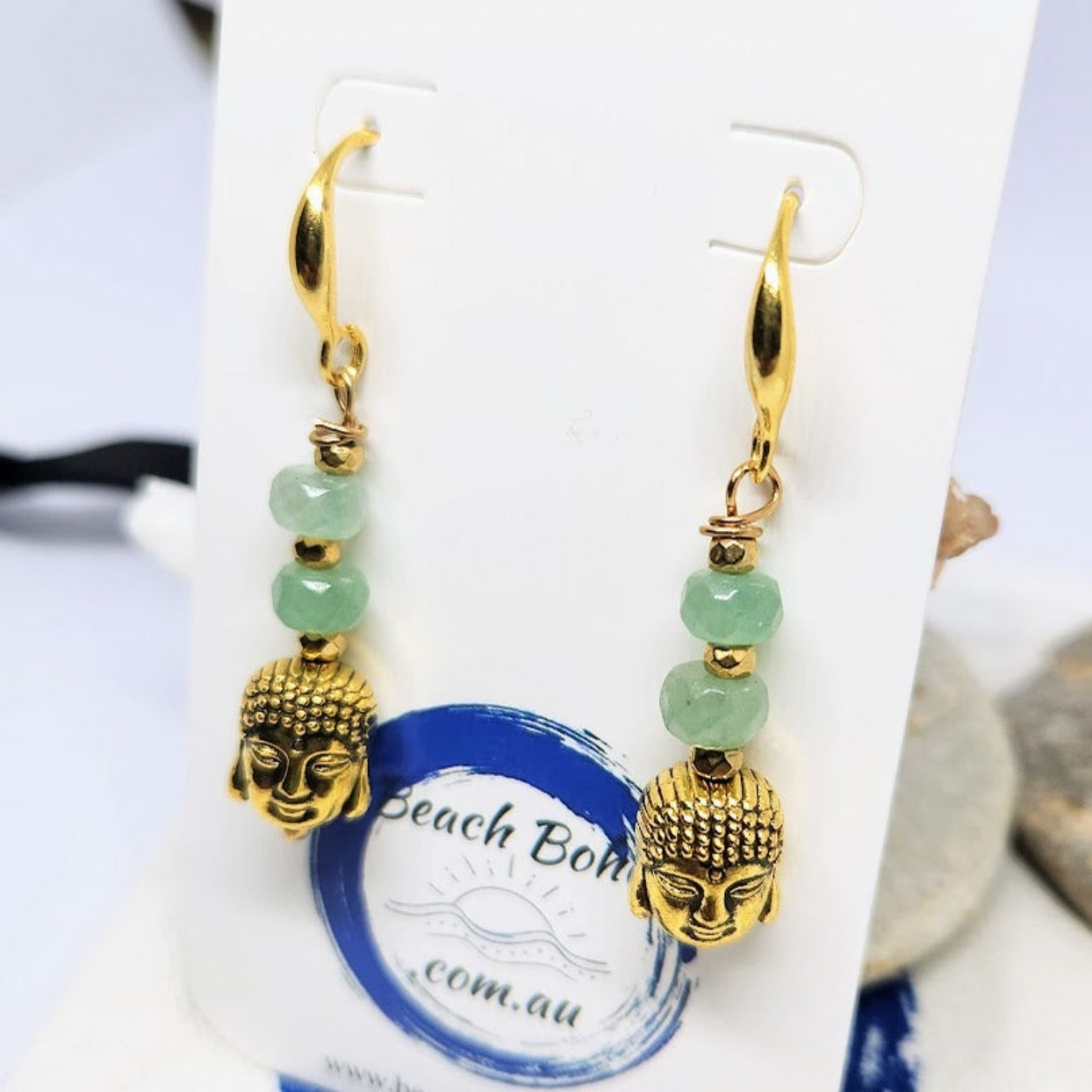 HandmadeĀ Aventurine Stone Buddha Head Drop 925 Gold Plated Hook Earrings / Hemitite Gold Spacer Beads / Vermeil Buddha Head