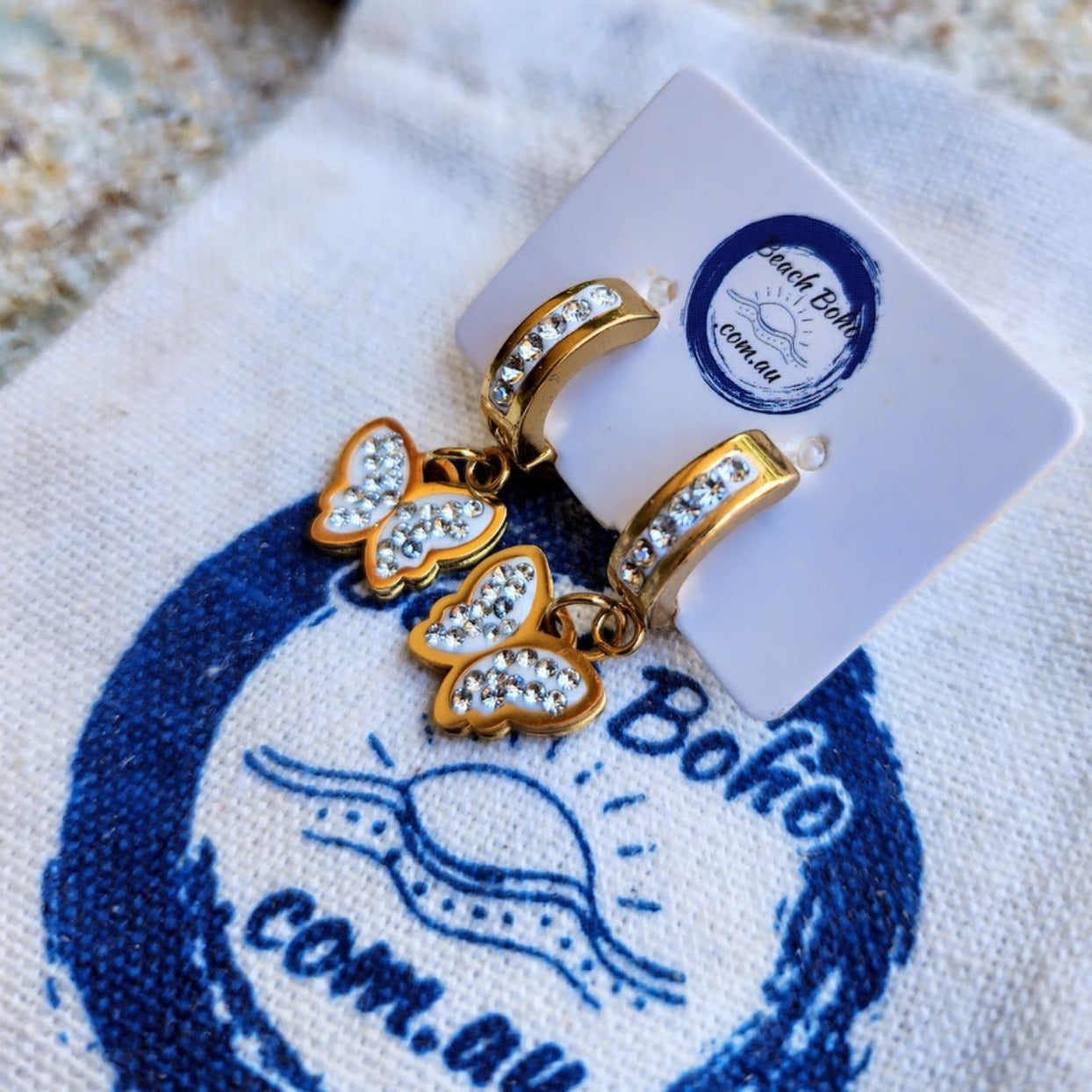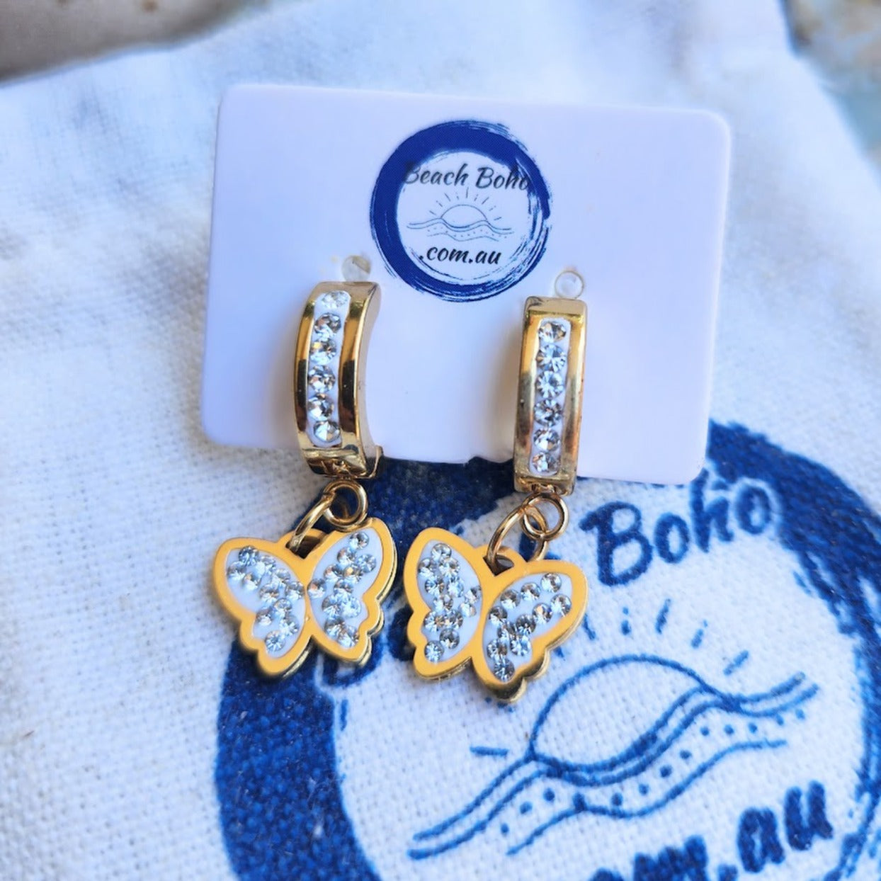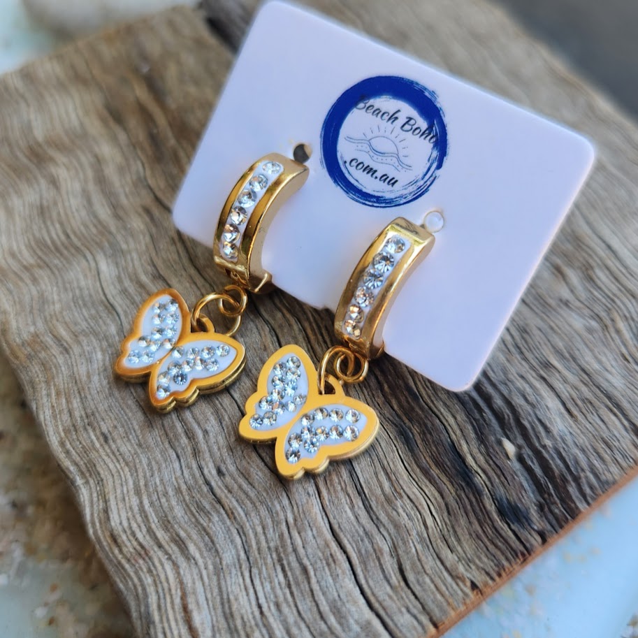 GOLDEN BUTTERFLIES - GOLD CUBIC ZIRCONIA WATERPROOF HUGGIE EARRINGS