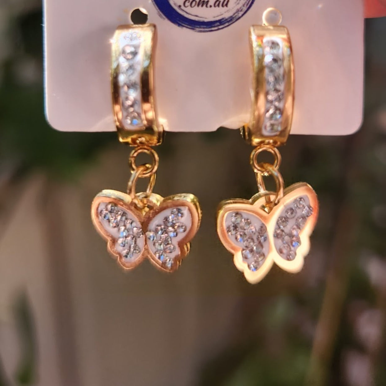 18k Gold Plated Butterfly Dangle Cubic Zirconia Huggie Hoop Earrings made with Titanium Steel Tarnish Resistant Jewellery 2 cm round.