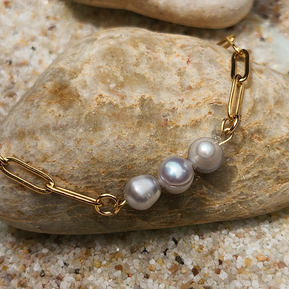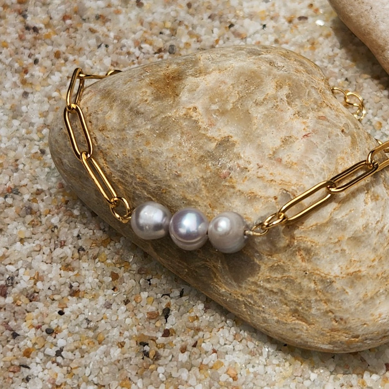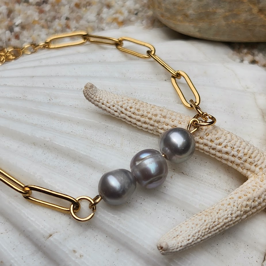 Handmade 18 ct Gold Plated Paperclip Baroque Grey Pearls Bracelet...