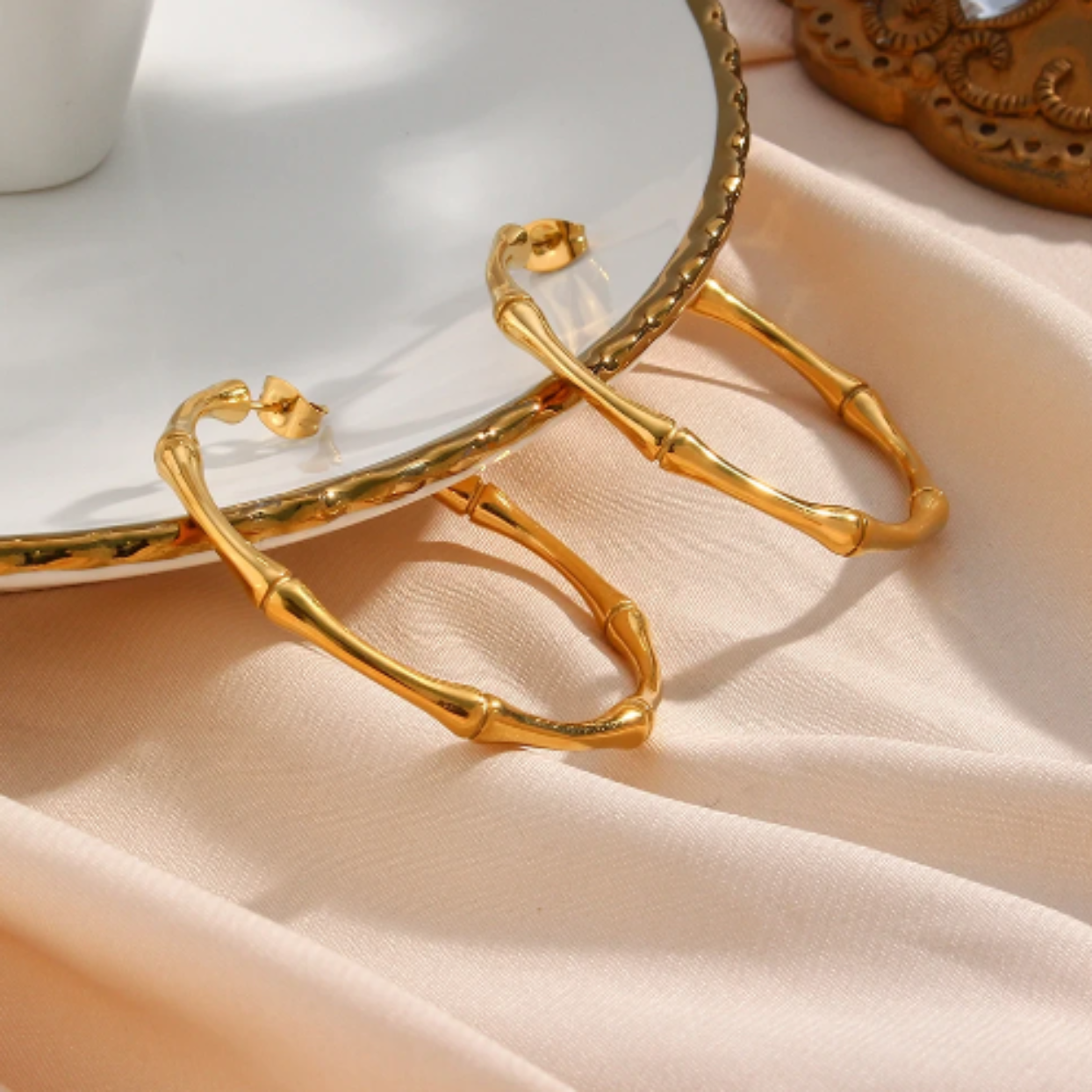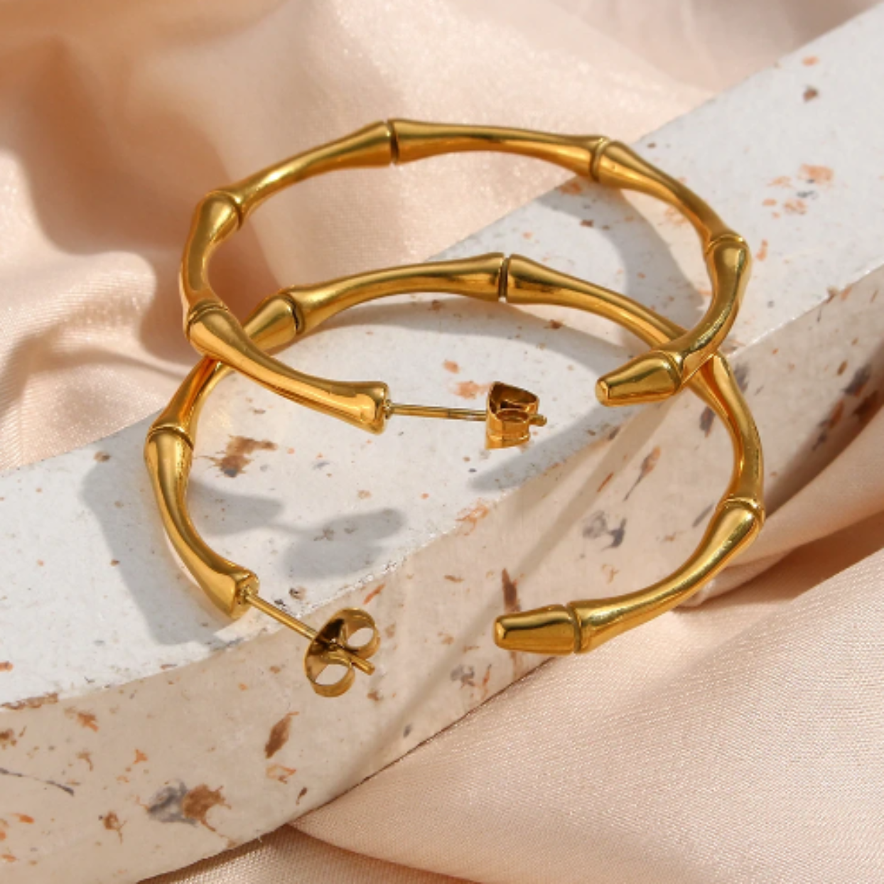 18k Gold Plated Bamboo Hoop Earrings made with Titanium Steel Tarnish Resistant Jewellery 4.6 cm round.