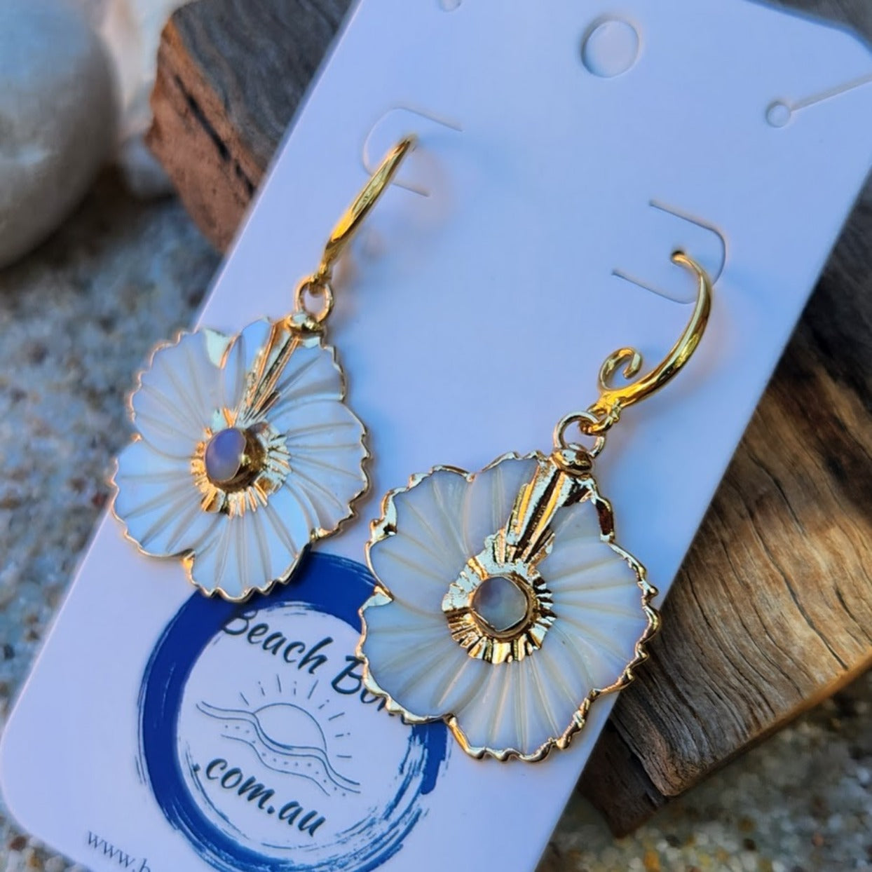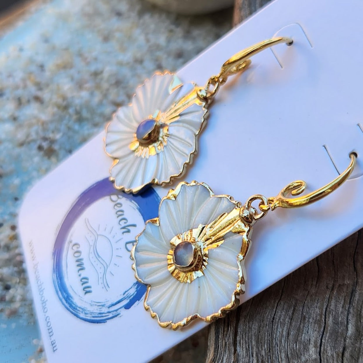 MOON FLOWERS - CARVED SHELL ELECTROPLATED HOOK EARRINGS