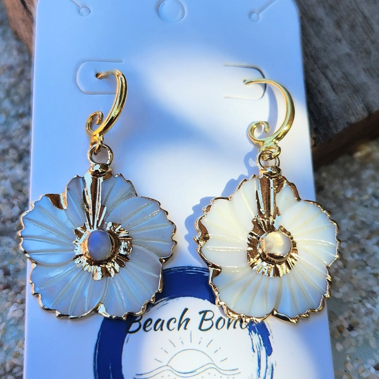 Electroplated Craved Flower Moonstone gold Hook Shell Earrings / Each Piece Unique & Handmade
