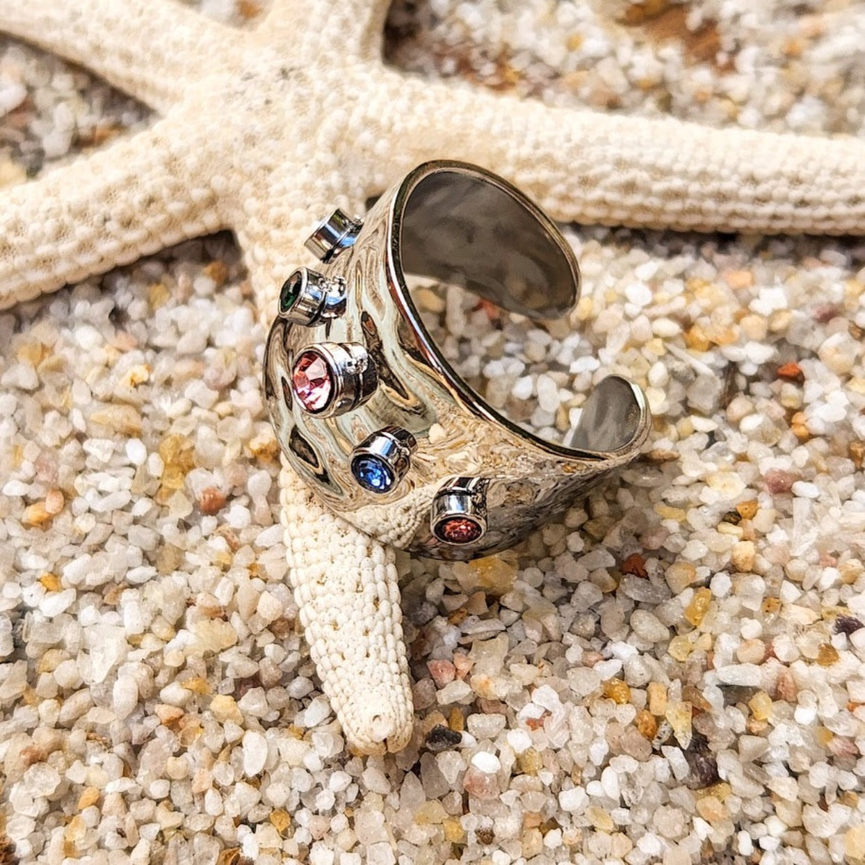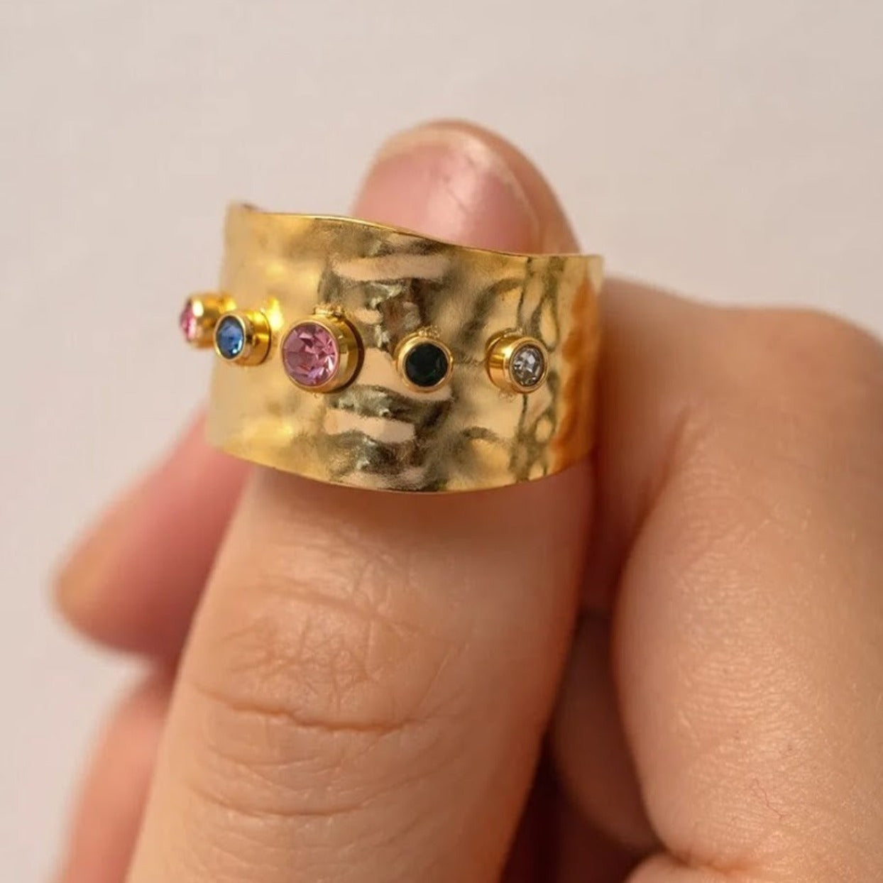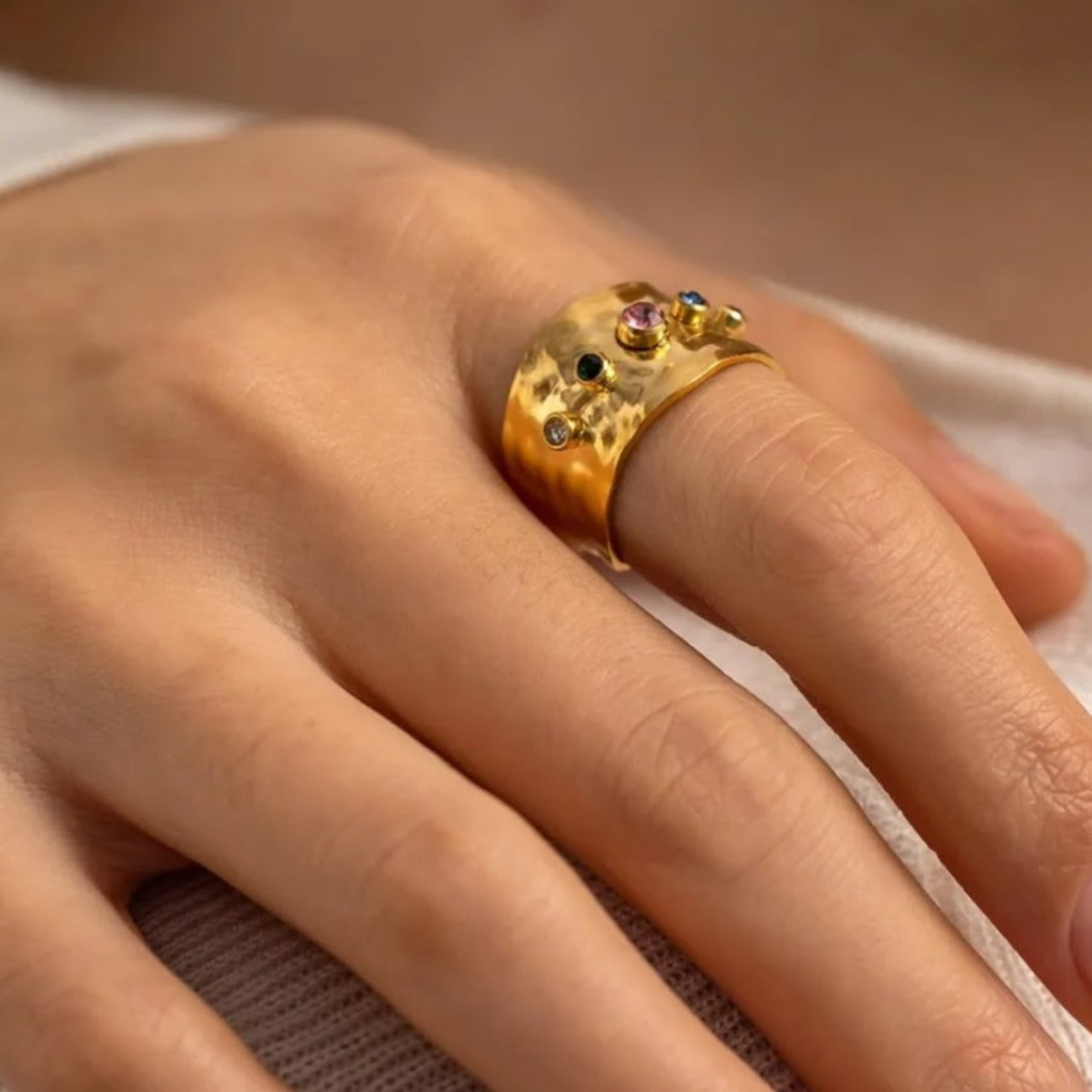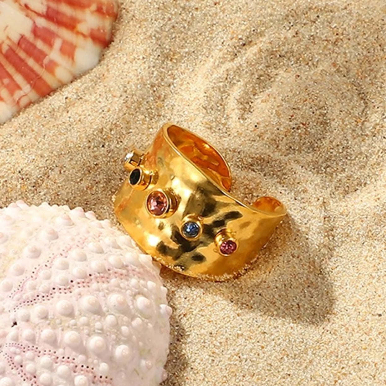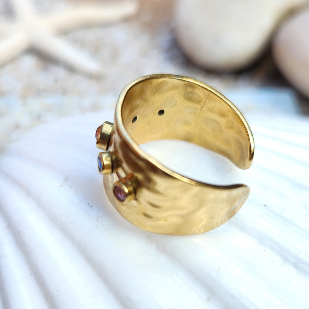 Unique irregular Hammered Cubic Zirconia Gold Band Open Adjustable Ring / 18k Gold Or Silver Plated Water Proof / Sweat Proof / Hyper Allergenic / Use at Gym, swimming... yours to enjoy (Etoile (star)