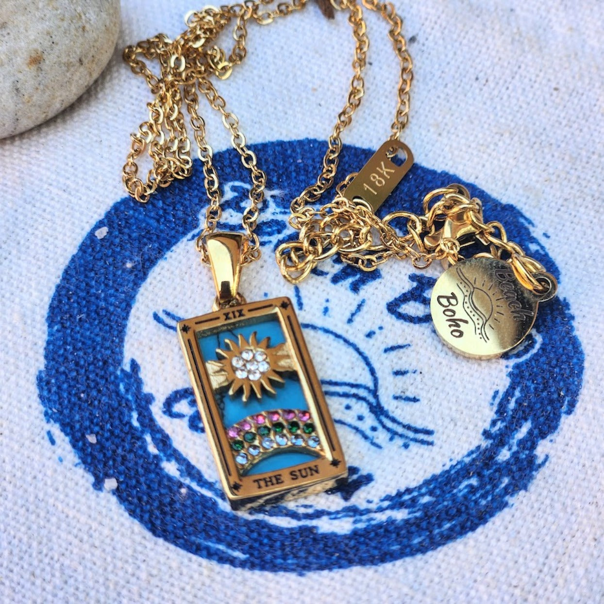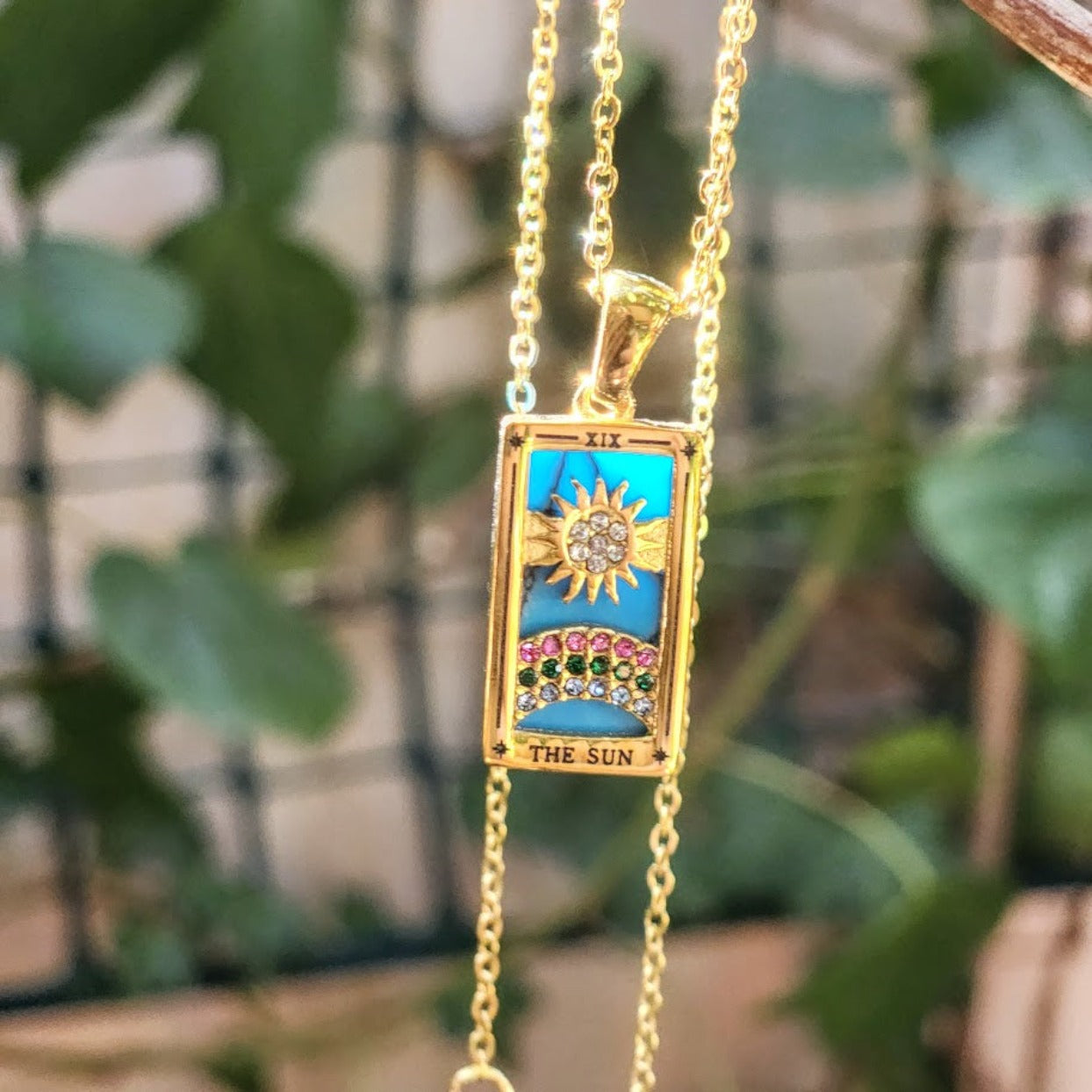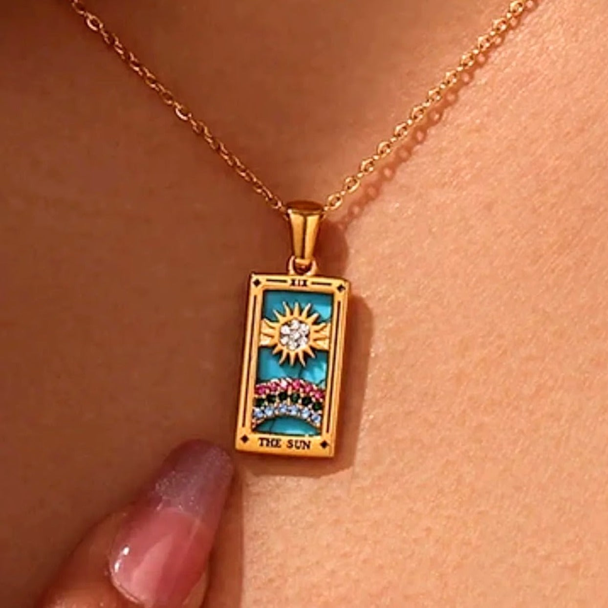 'The Sun' Tarot Pendant 18kt Gold Charm with Blue Pink & White Cubic Zirconia 18 ct Gold Plated Necklace