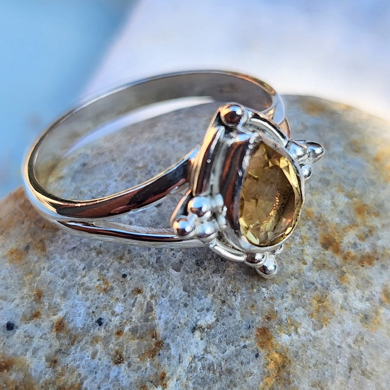 Handmade Artisan Teardrop Natural Citrine 925 Sterling Silver Ring / With Beautiful Beading Detailing