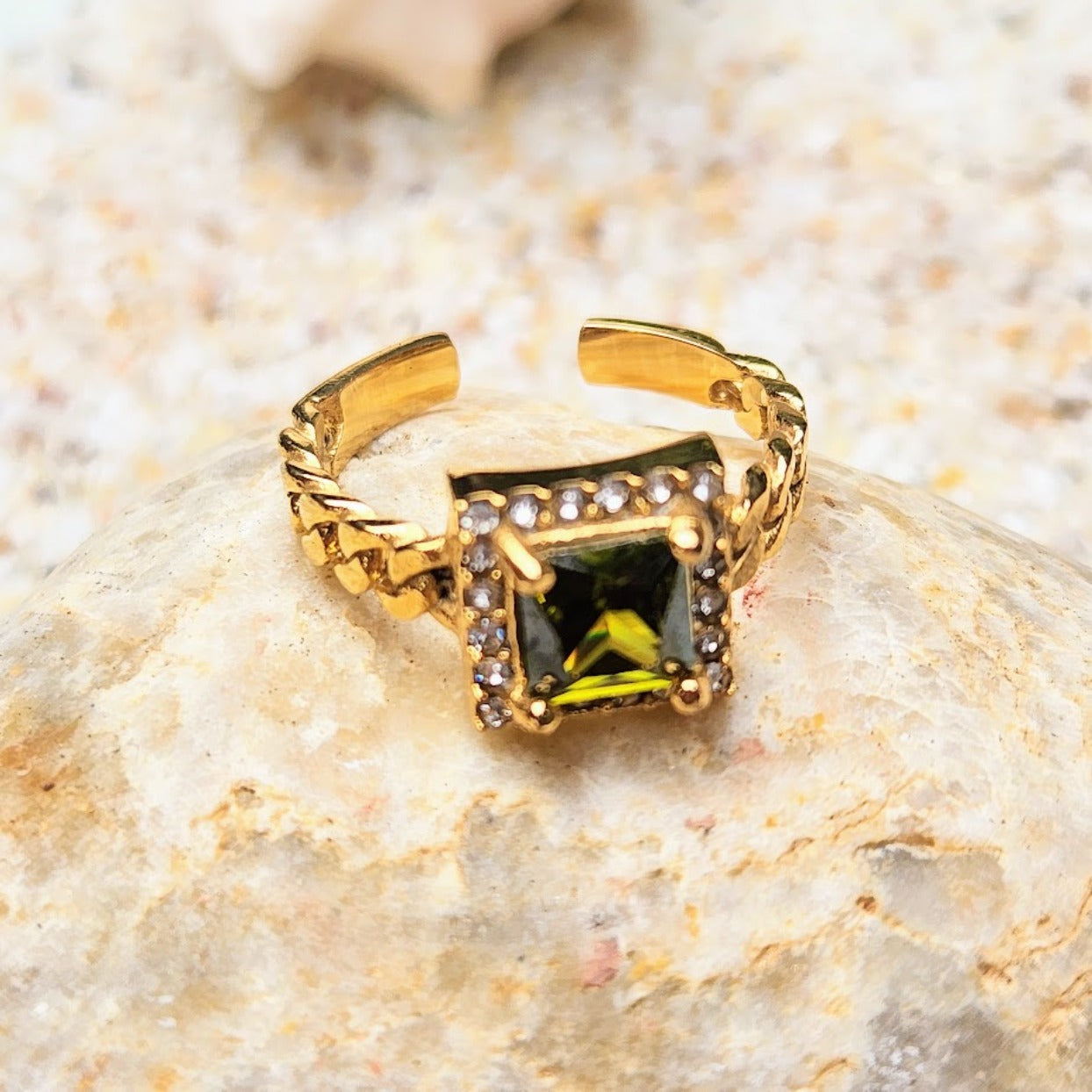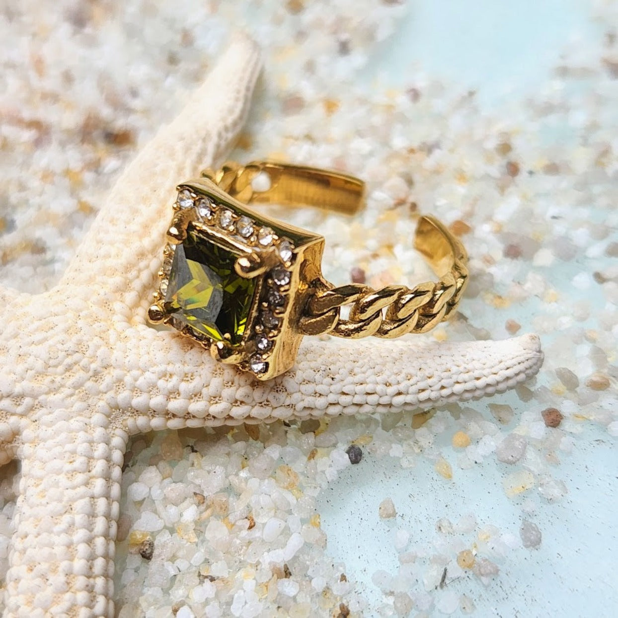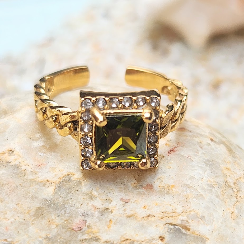 18k gold plated Peridot & Cubic Zirconia Chain/Rope Square Designed Ring - Fully Adjustable from approx. size 6 to 10 in ring sizing