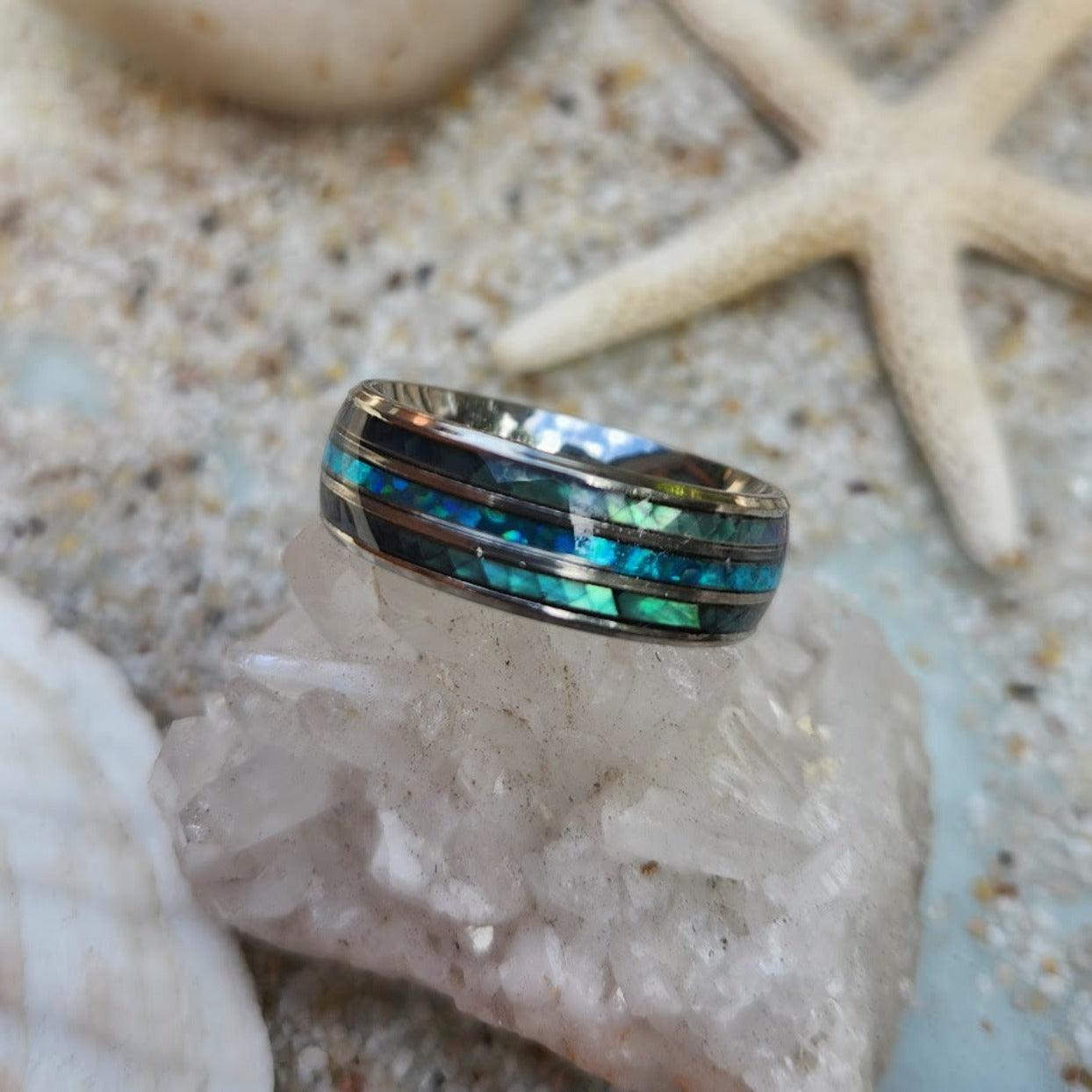 Paula Shell & Opal Inlay Waterproof Silver Men's Ring