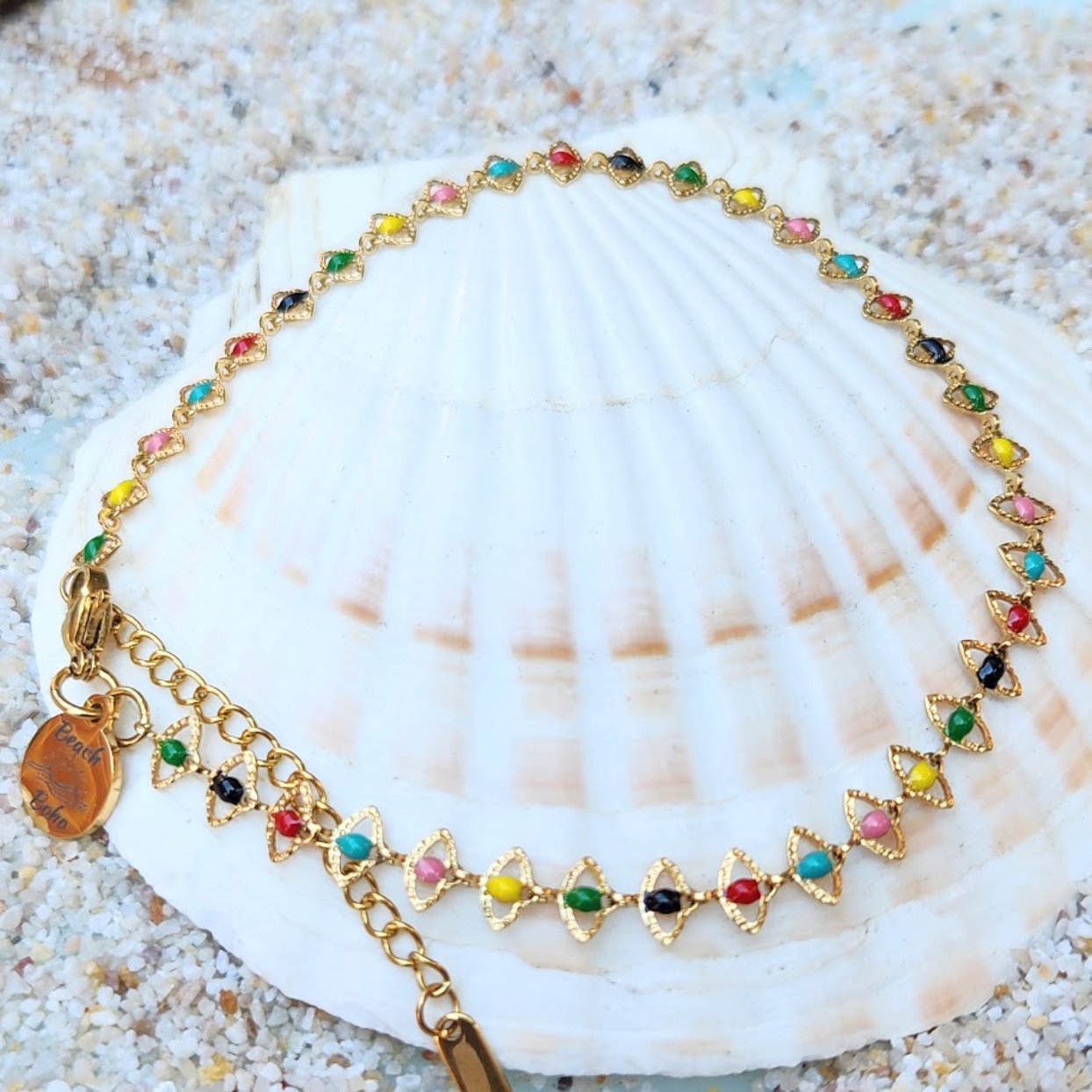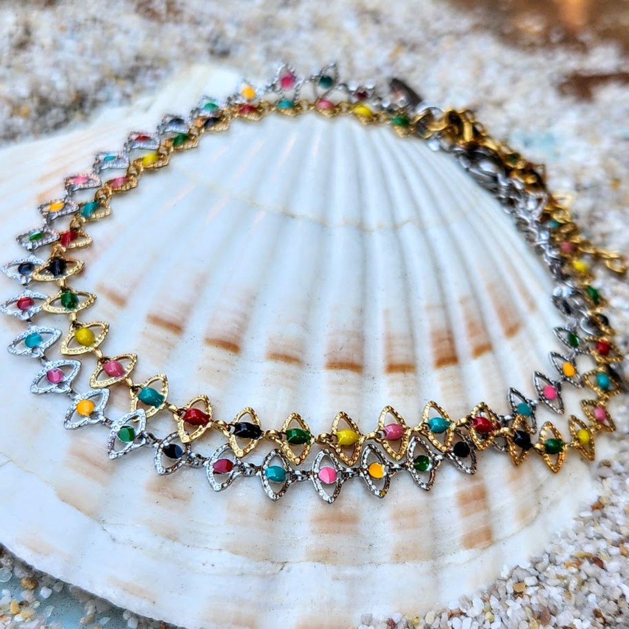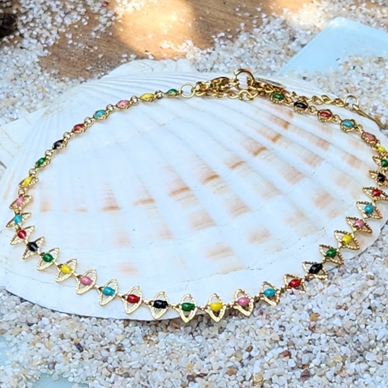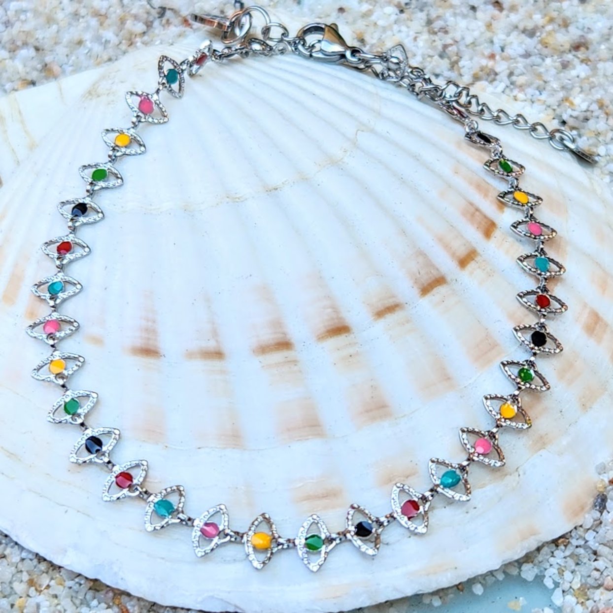Handmade Beautiful detailed Evil Eye Chain Anklet 18k Gold Plated (Stainless Steel) Rainbow enamel colours /Waterproof / Sweat Proof / Hyper Allergenic / Use at Gym, swimming... yours to enjoy all day and all night long