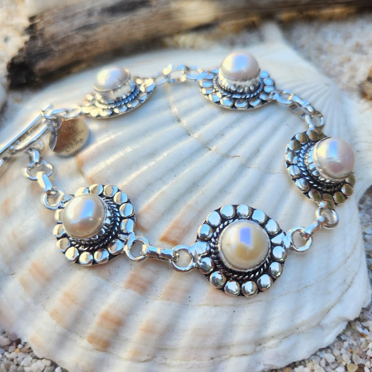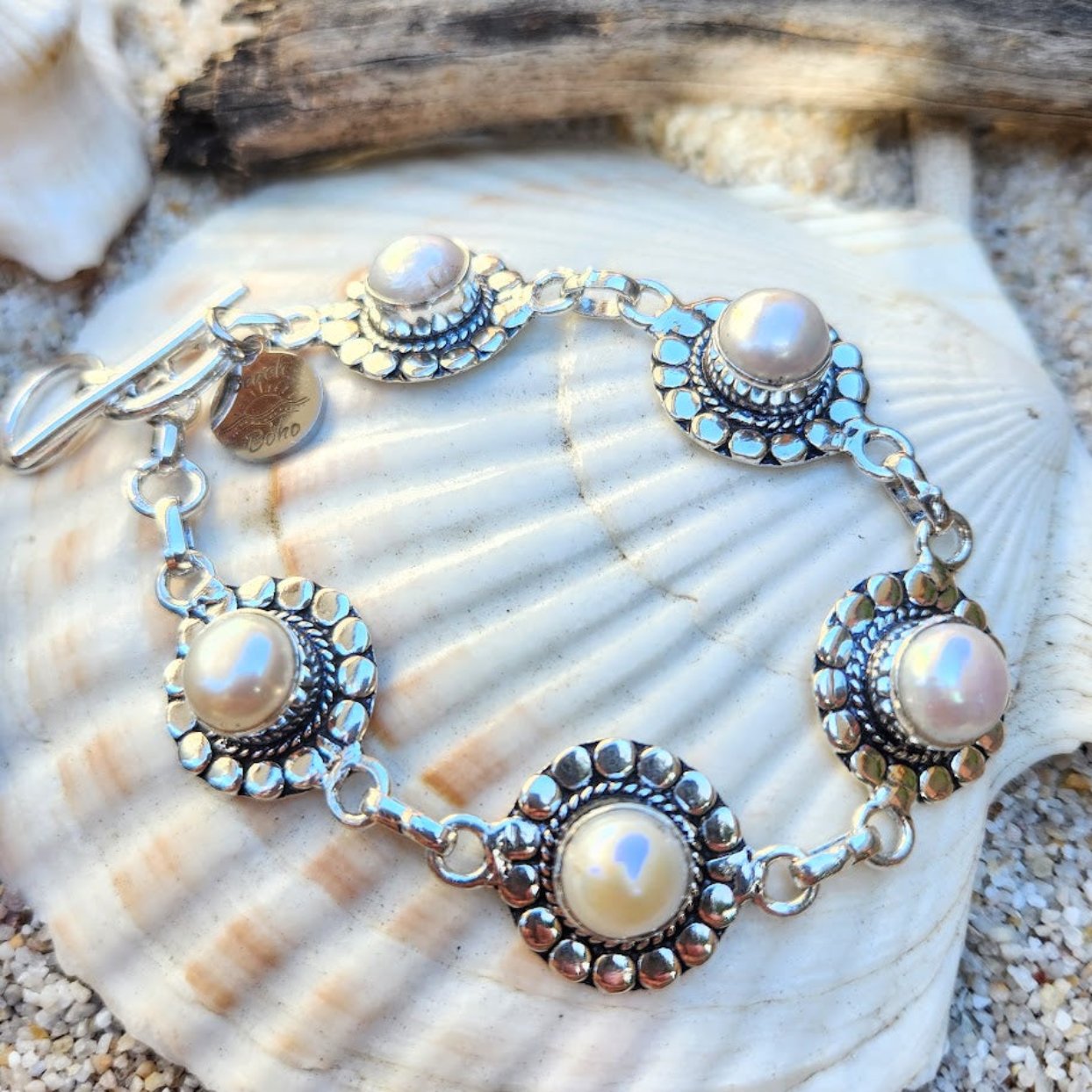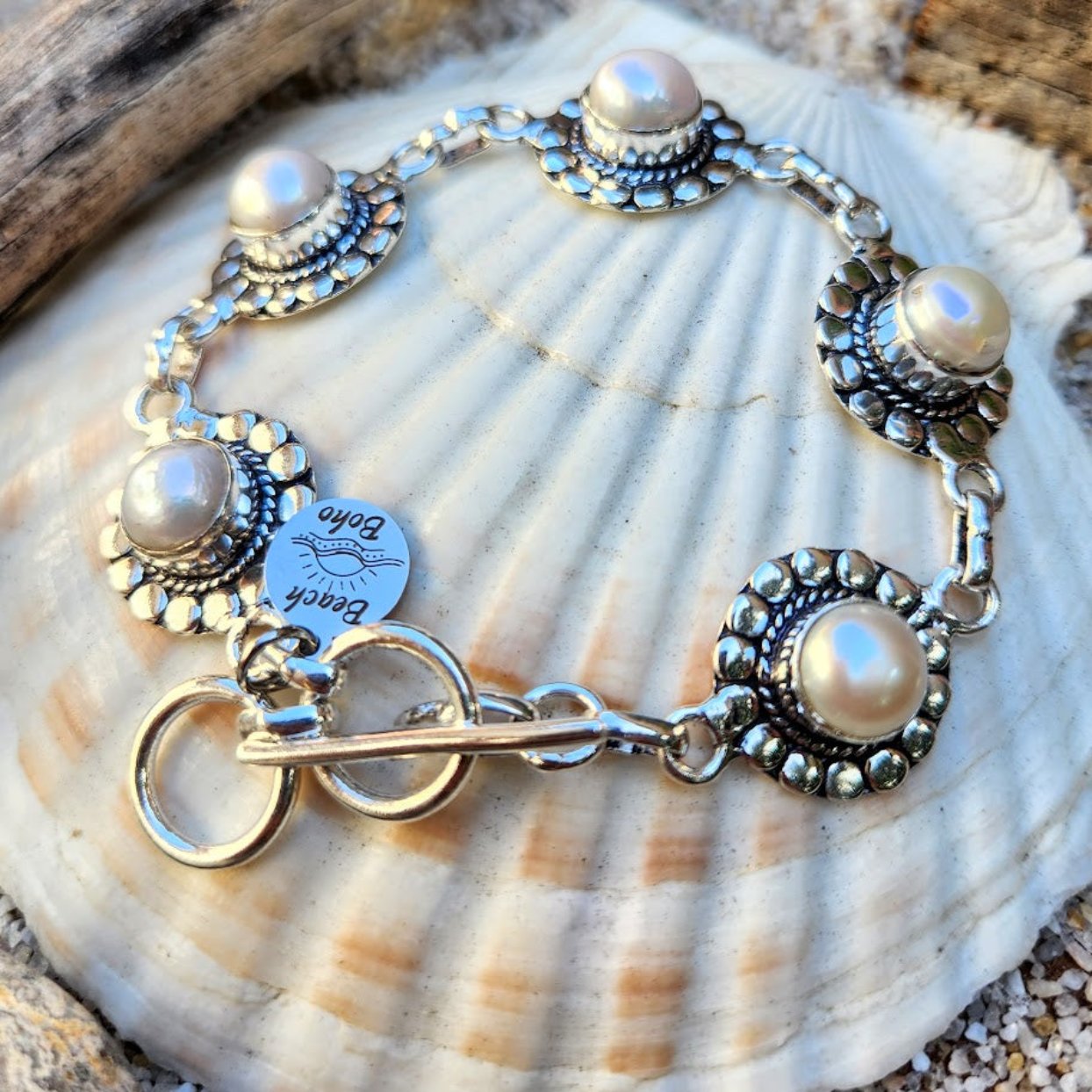 Stunning superb Fresh Water Baroque Pearls 5 charms Set in Flower design 925 Sterling Silver - 1cm width 2 cm length Charms - 925 Sterling Silver Handmade Toggle Bracelet -