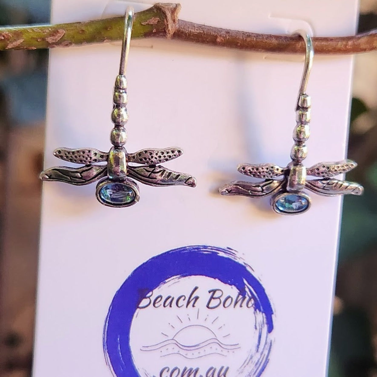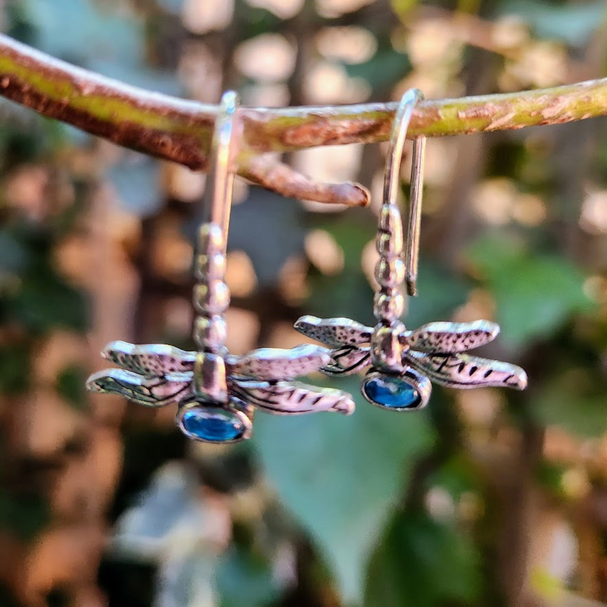 DRAGONFLY - BLUE TOPAZ CRYSTAL SILVER HOOK EARRINGS