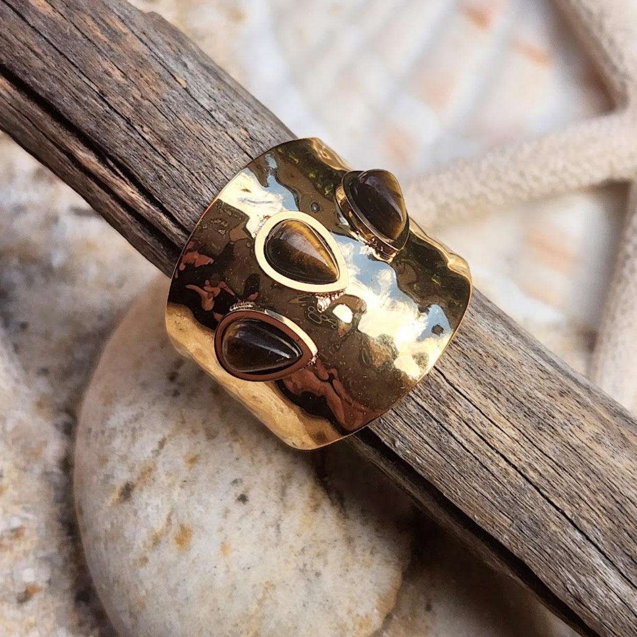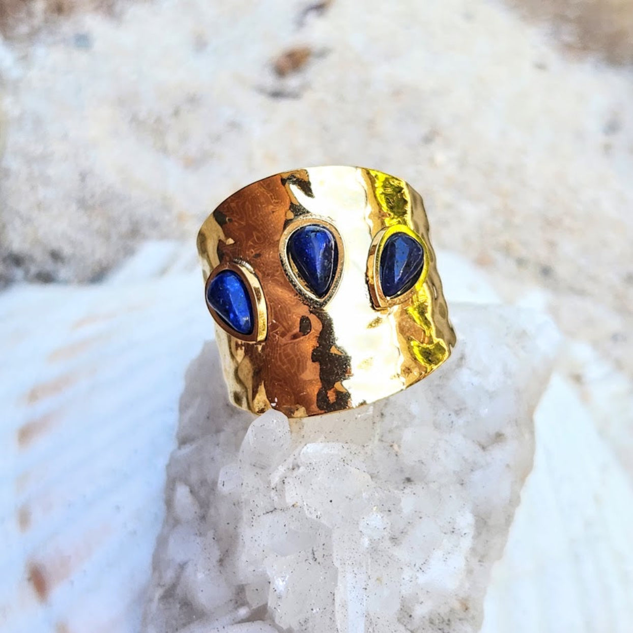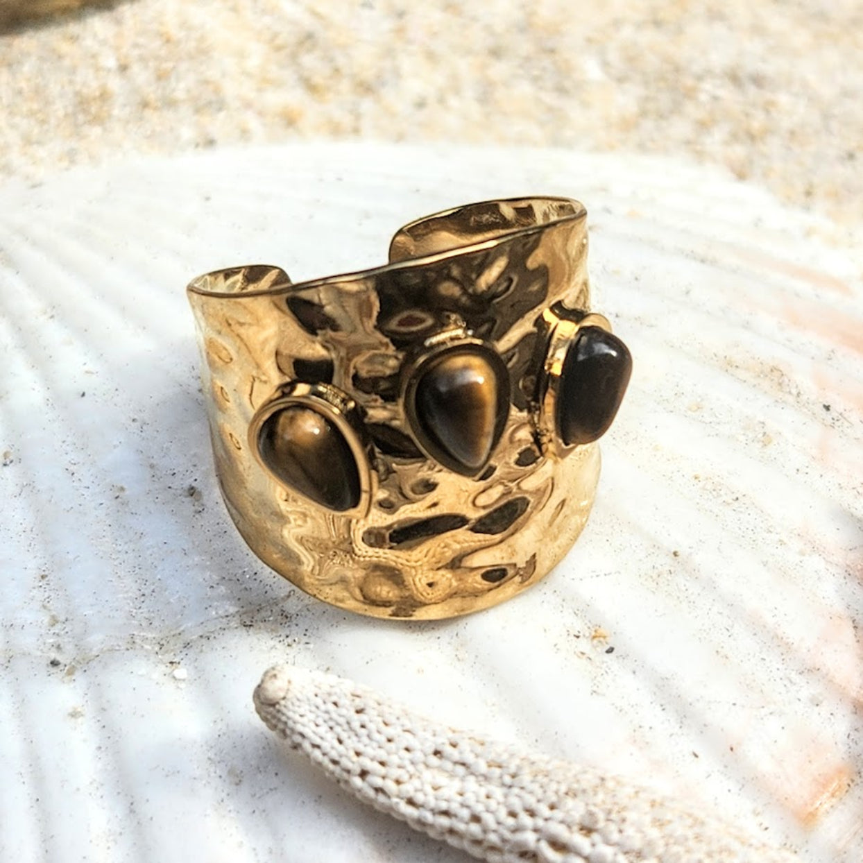 Unique irregular Hammered Teardrop Lapis Lazuli or Tiger Eye Stones Gold Band Open Adjustable Ring