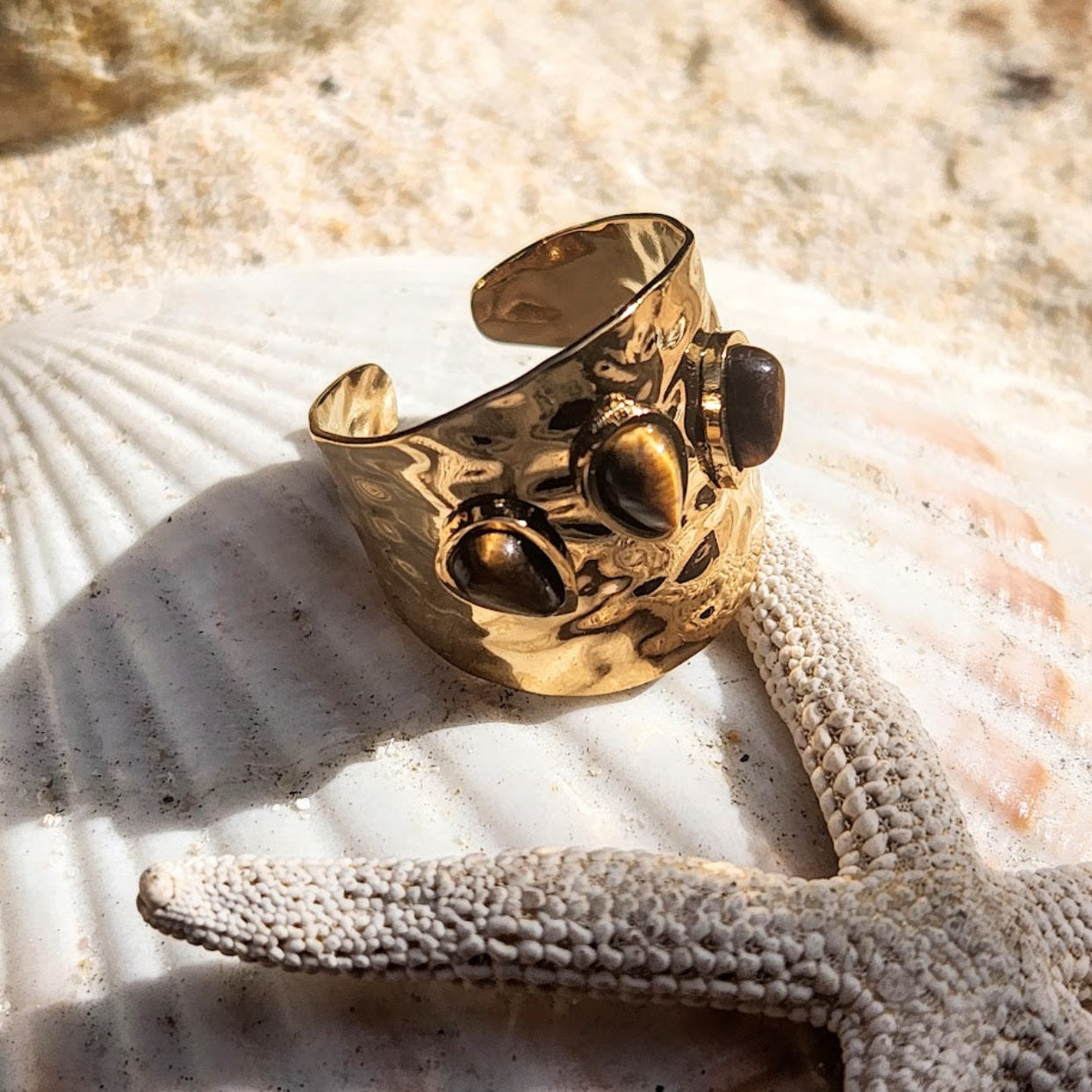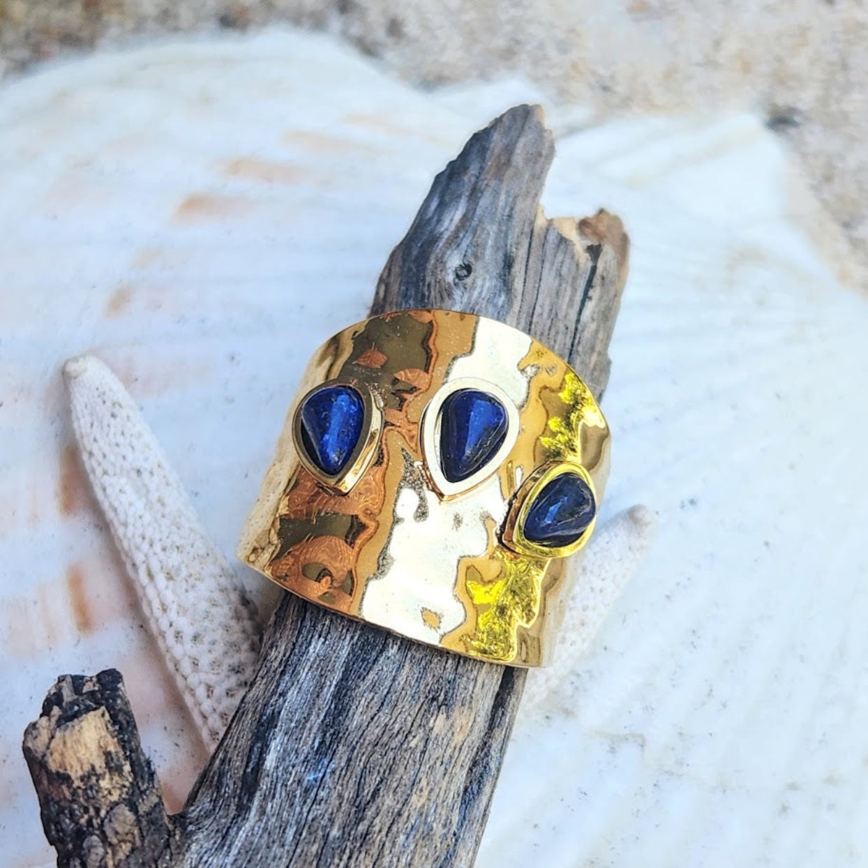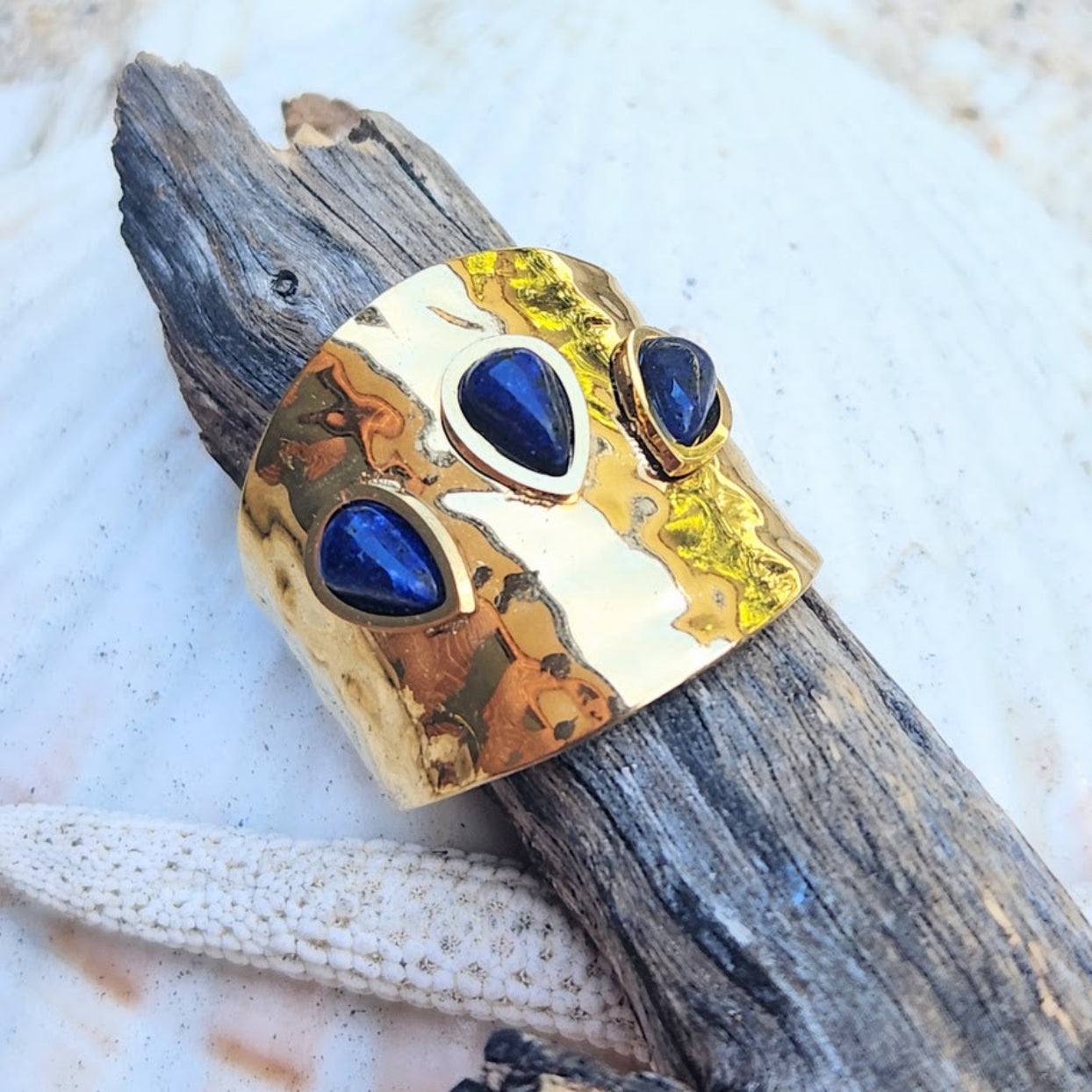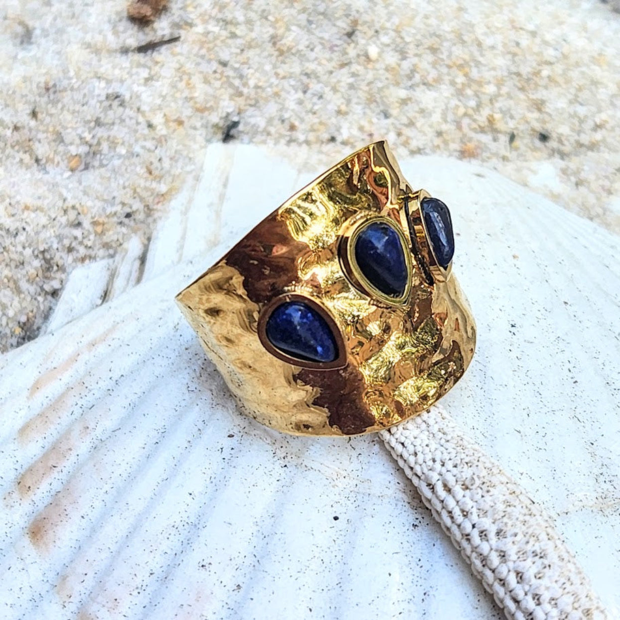 Unique irregular Hammered Teardrop Lapis Lazuli or Tiger Eye Stones Gold Band Open Adjustable Ring