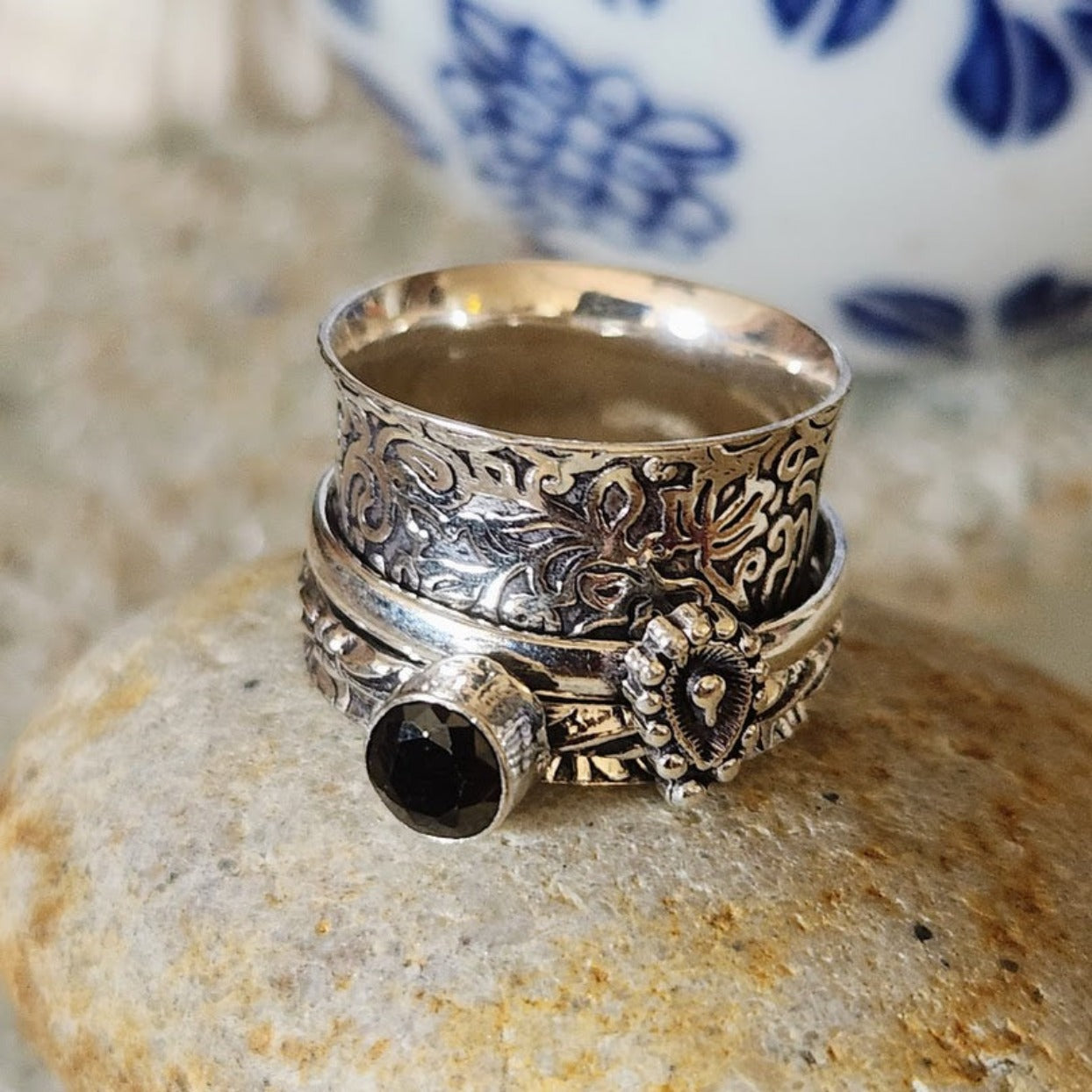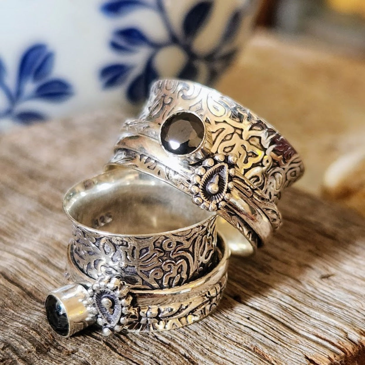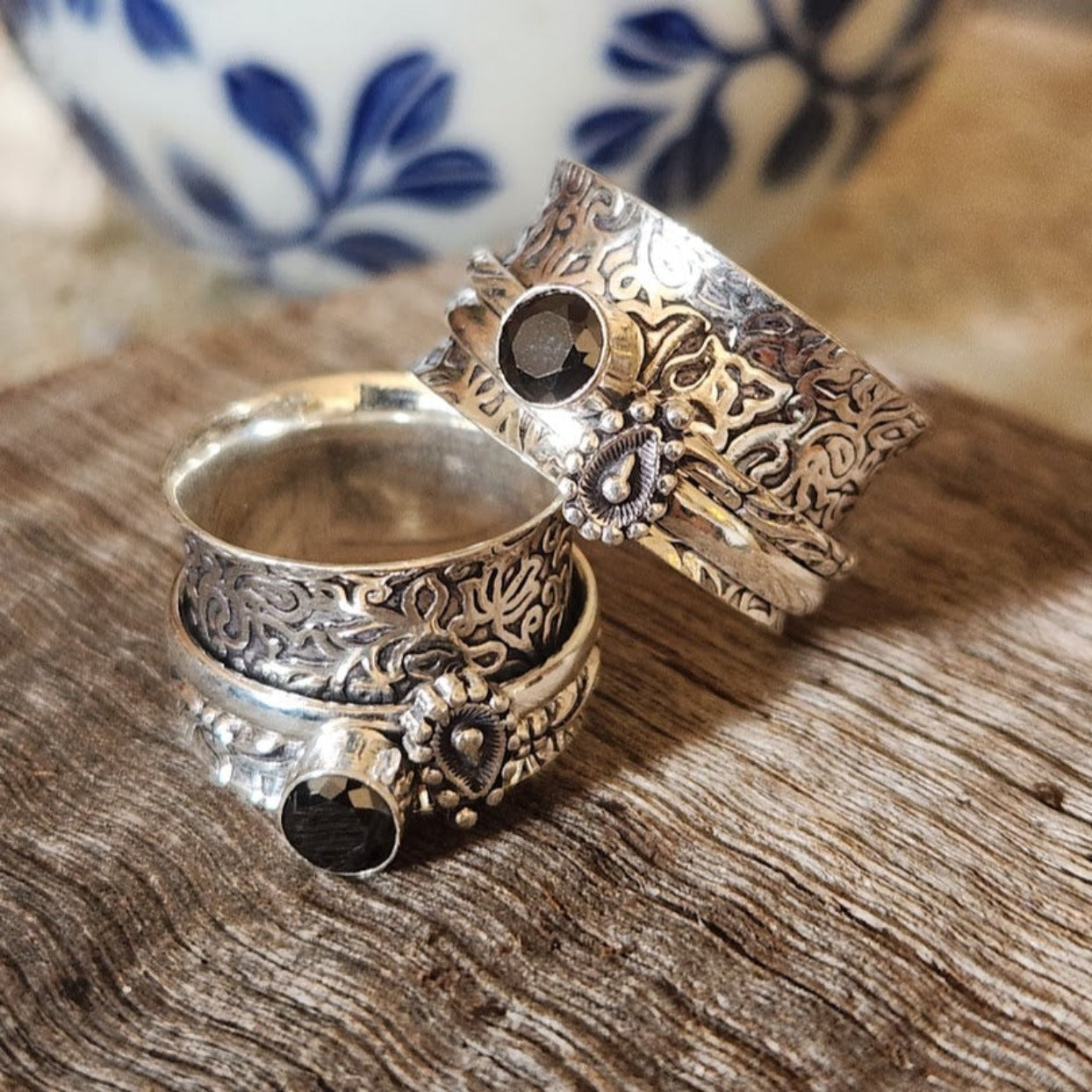 Onyx spinner 925 Sterling Silver ring / Stunning Stamped Silver Detailing