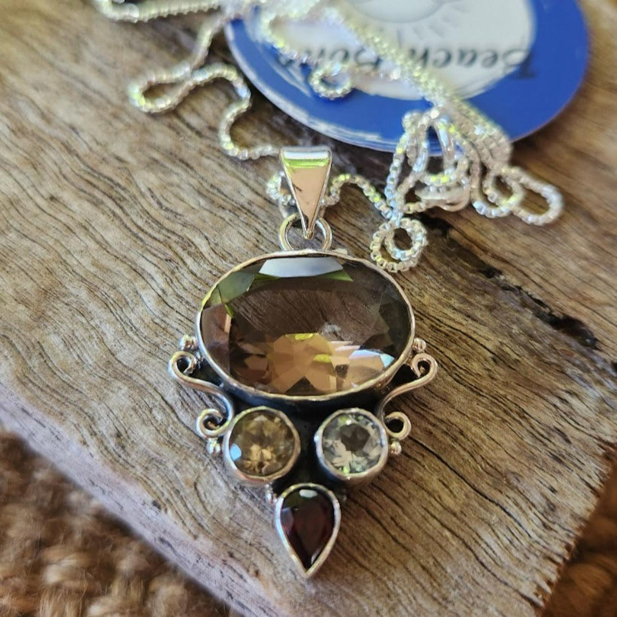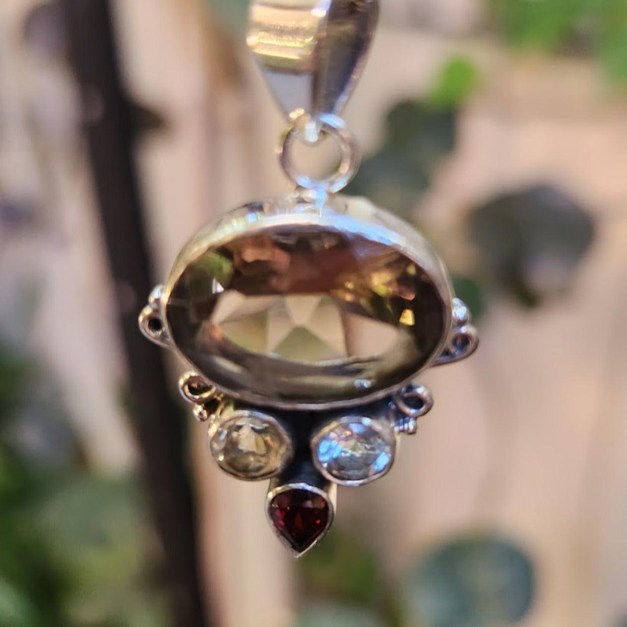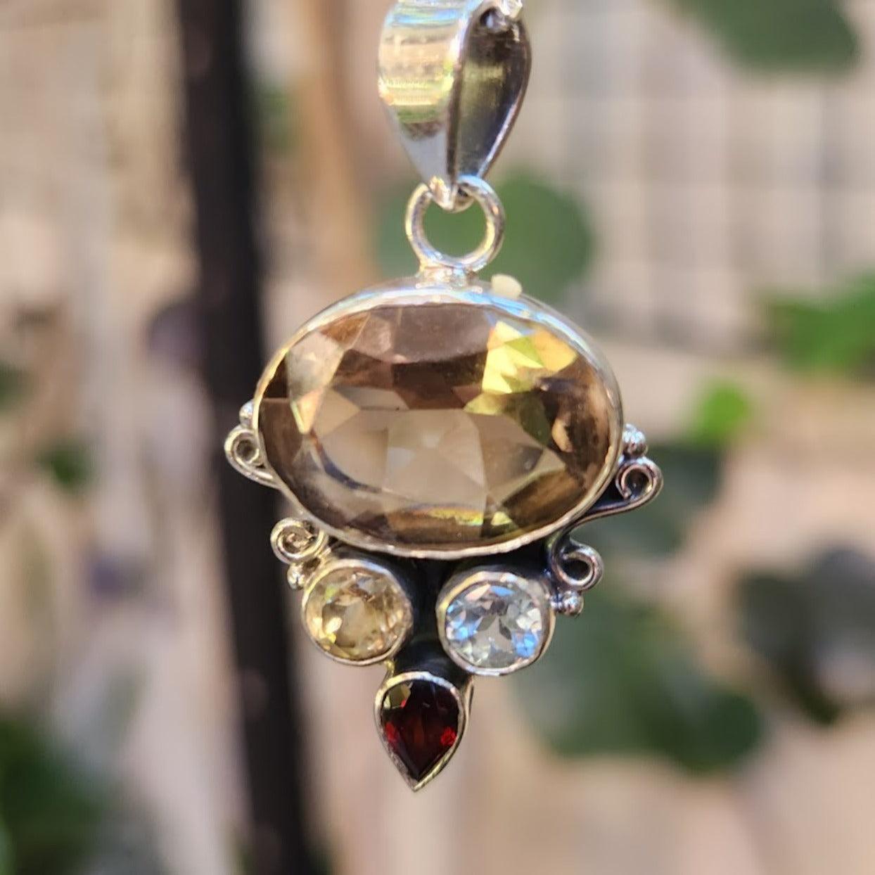Handmade Smoky Quartz / Citrine / Aquamarine & Garnet Sterling Silver Pendant with Wonderful Soldering Detailing & 18 inch Sterling Silver Necklace included / with Silver Polishing Cloth