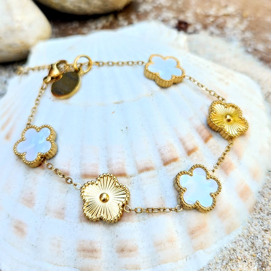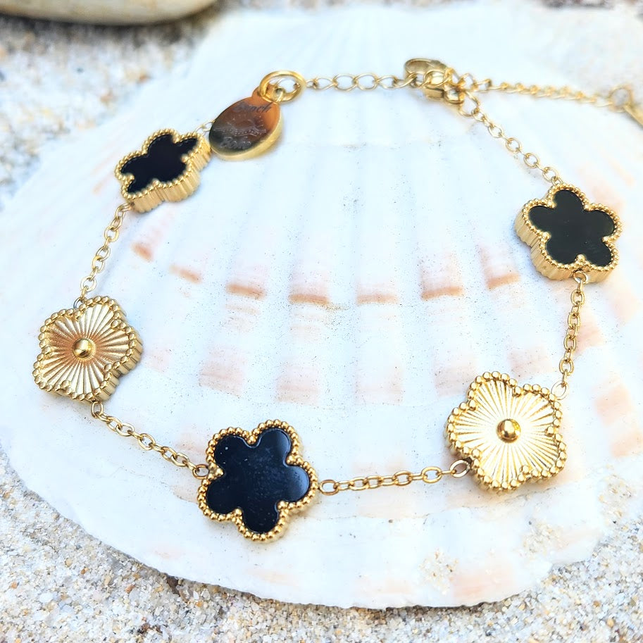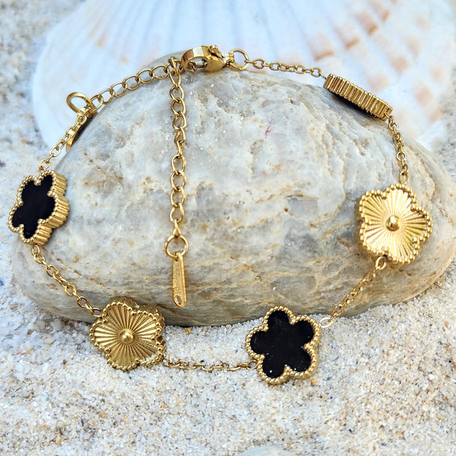 Waterproof Four Leaf Clover 18k Gold Chain Bracelet White or Black with Intermittent Gold Charms