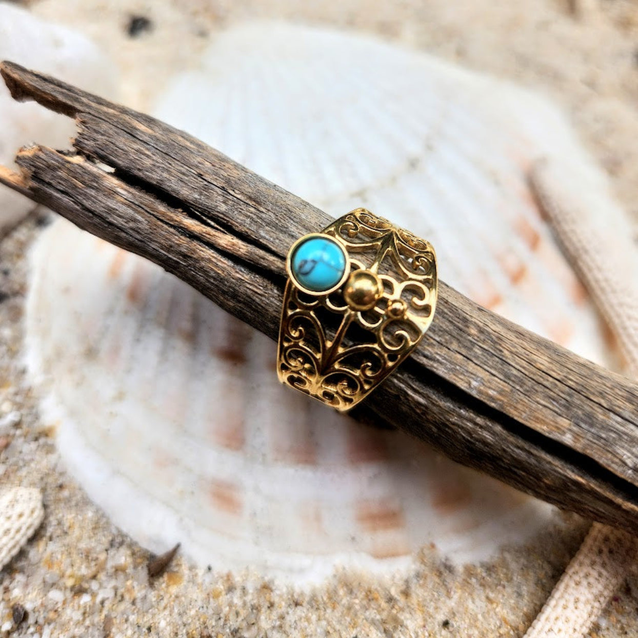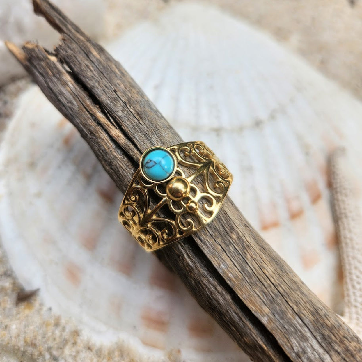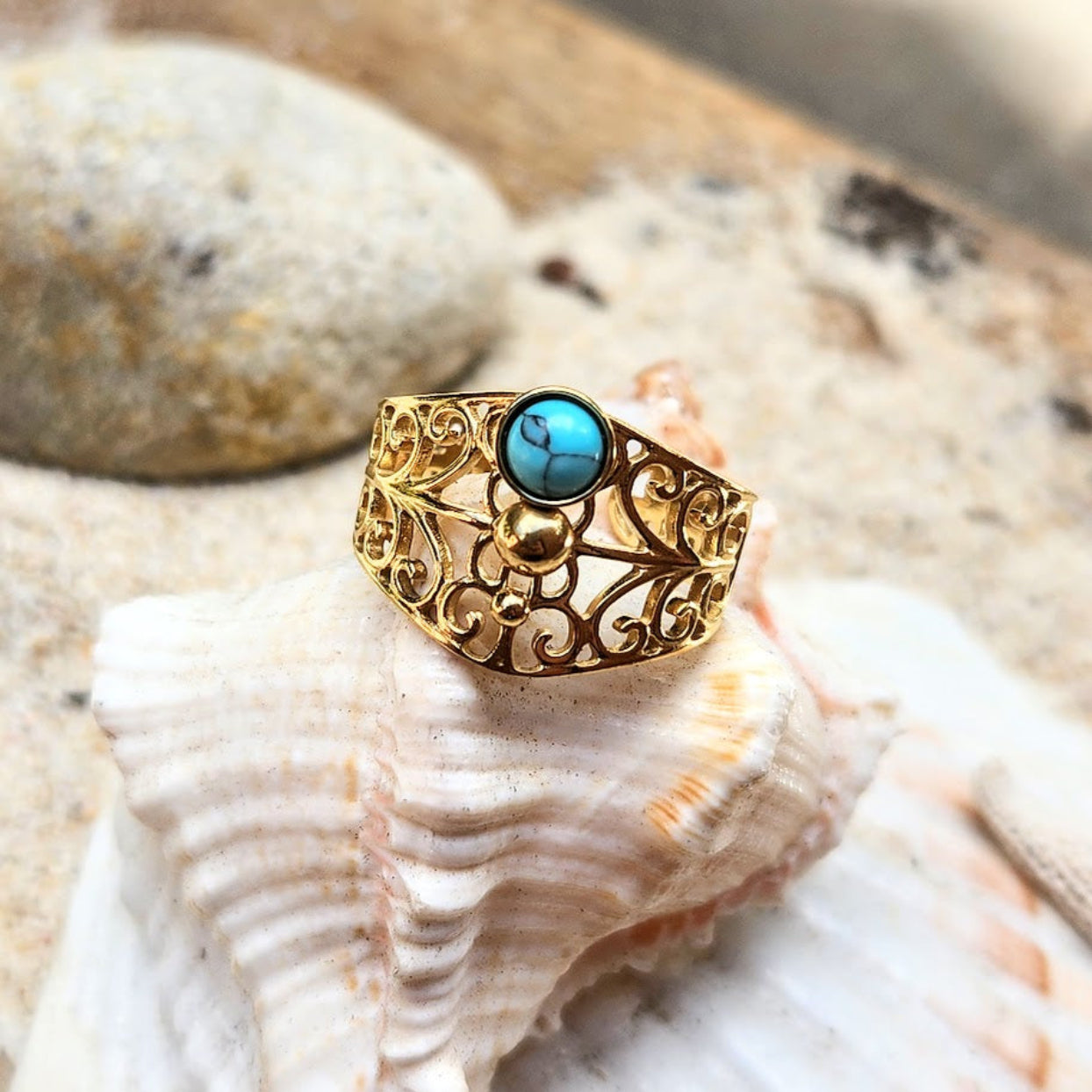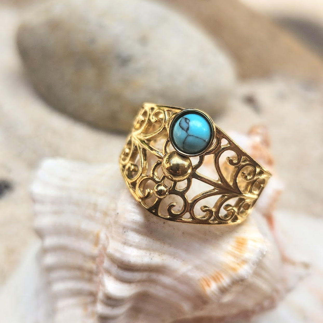 Detailed Embossed Designed Turquoise Stone 18k Gold Waterproof Ring