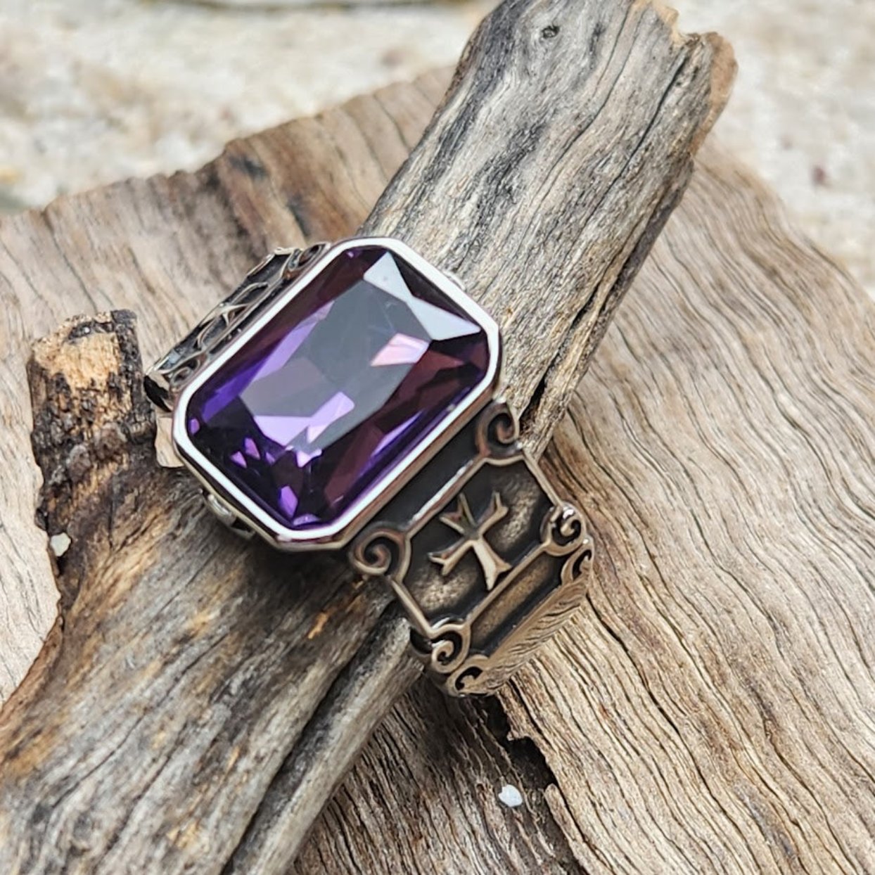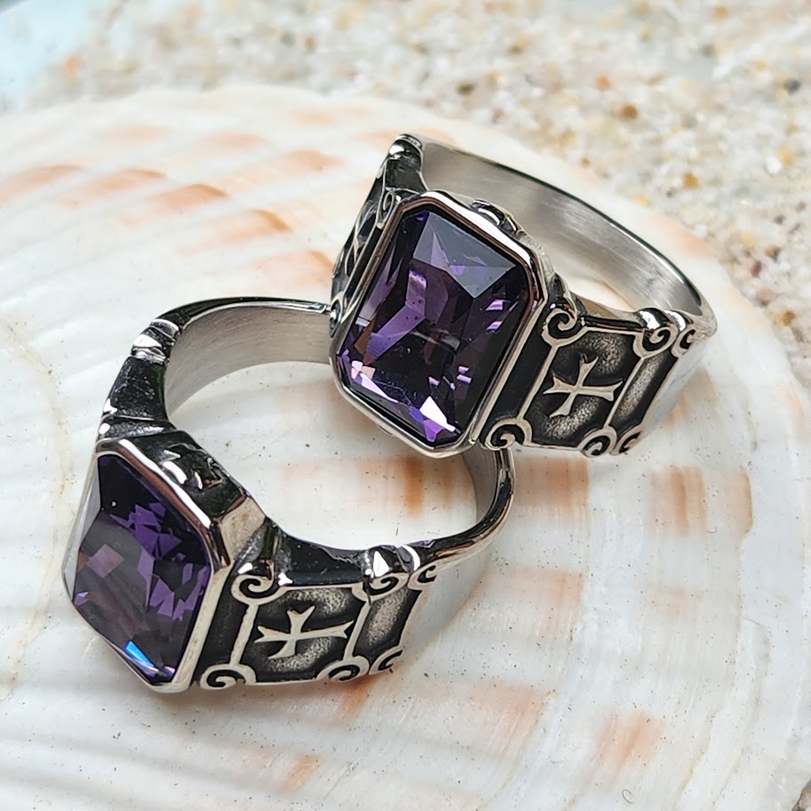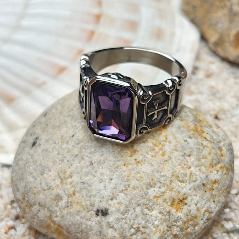 Silver Amethyst Crystal in Crossed Detailed Crafted Ring Waterproof Men's Ring